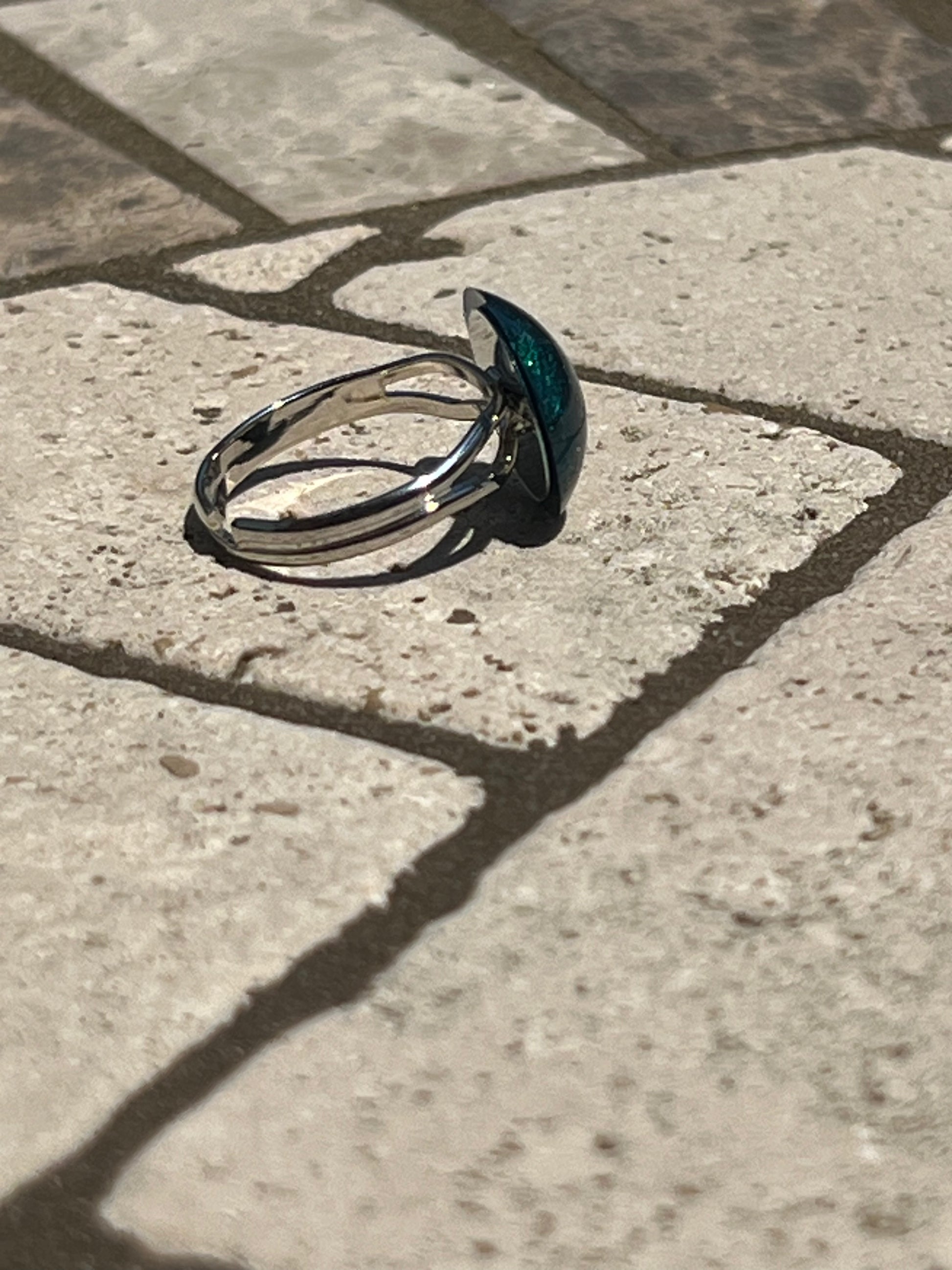 This stunning silver ring is the perfect accessory for any occasion. Adorned with a gorgeous dark emerald green gem handmade with epoxy, it's sure to draw glances. A timeless piece of jewelry to add to any outfit.