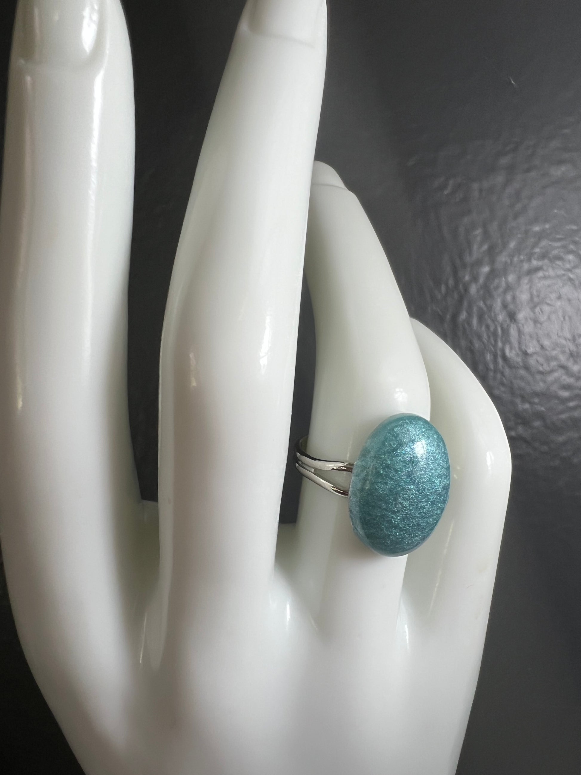 This exquisite ring features a delicate, silver band, showcasing a breathtaking light blue epoxy stone. Its perfect symmetry makes it a timeless accessory and a stunning conversation piece. Get a piece of timeless elegance with this beautiful silver ring.