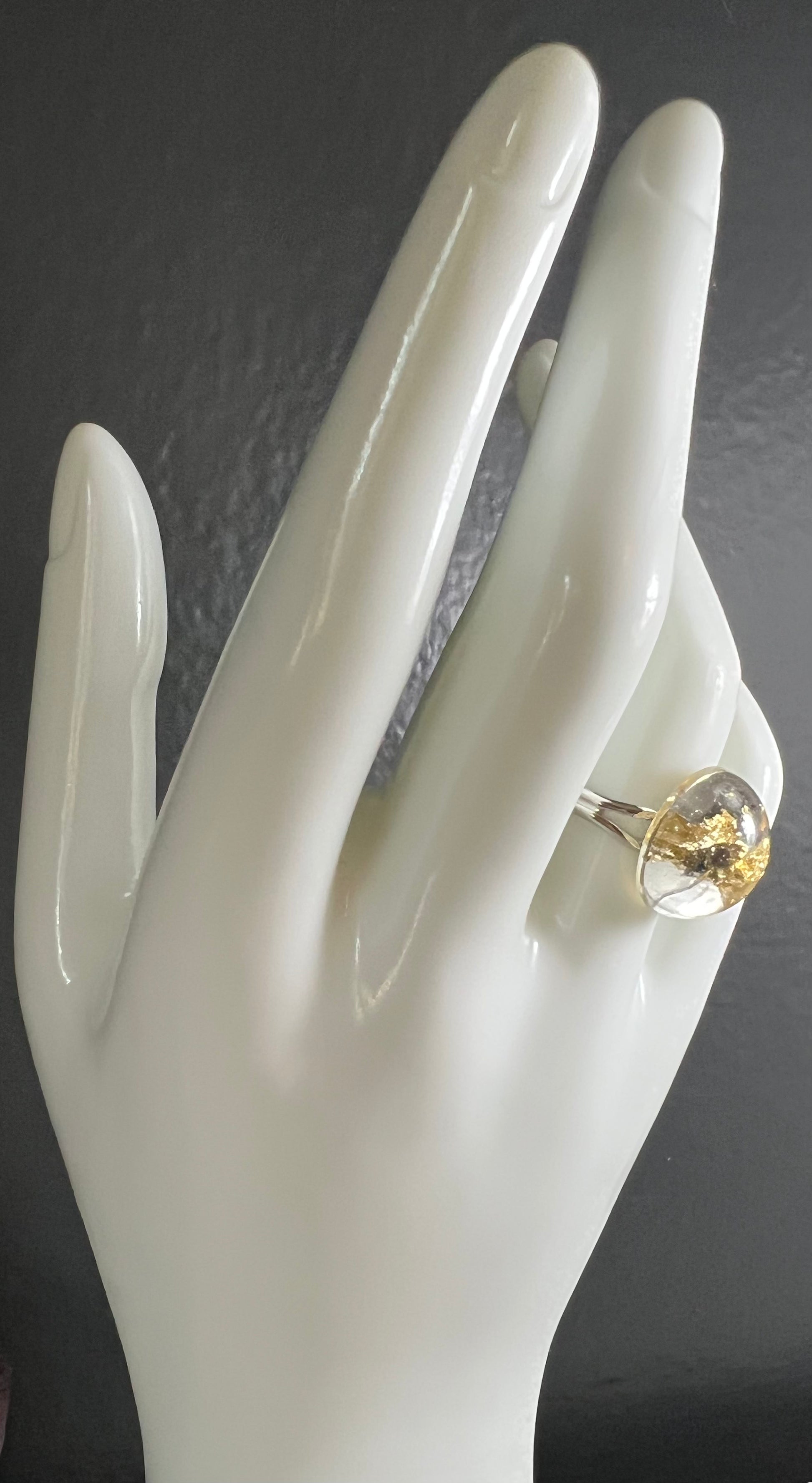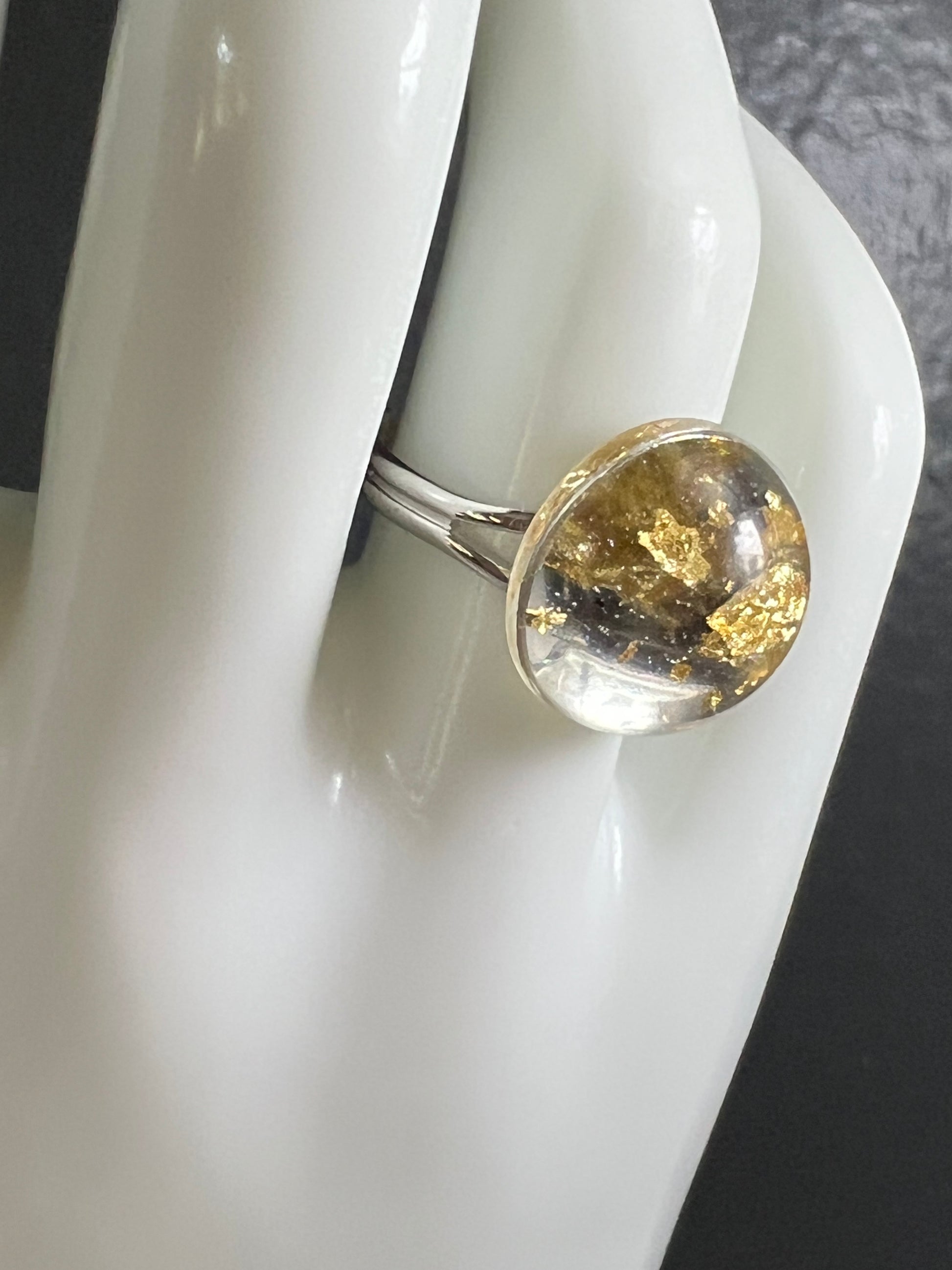 This Ring is a stunning statement piece, handmade with a pendant of clear epoxy and gold flakes. Its adjustable silver band makes it easy to customize for your comfort. This stylish accessory is sure to up your look with its classic and elegant design.