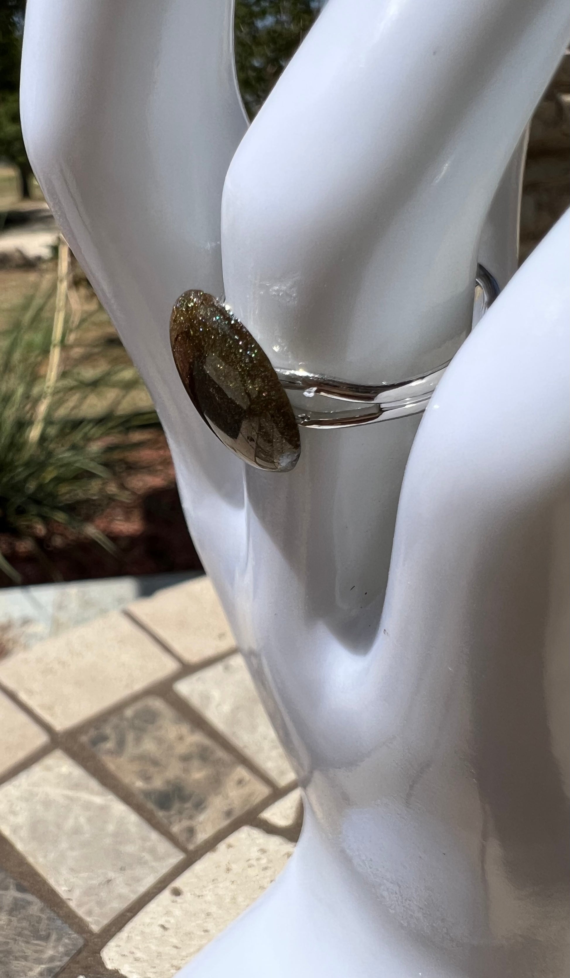 This stunning ring combines silver with a unique flat and light-weight gem that is a blend of dark brown and shimmering gold creating a mesmerizing piece of jewelry. It's perfect for accenting any look and is sure to make a statement.