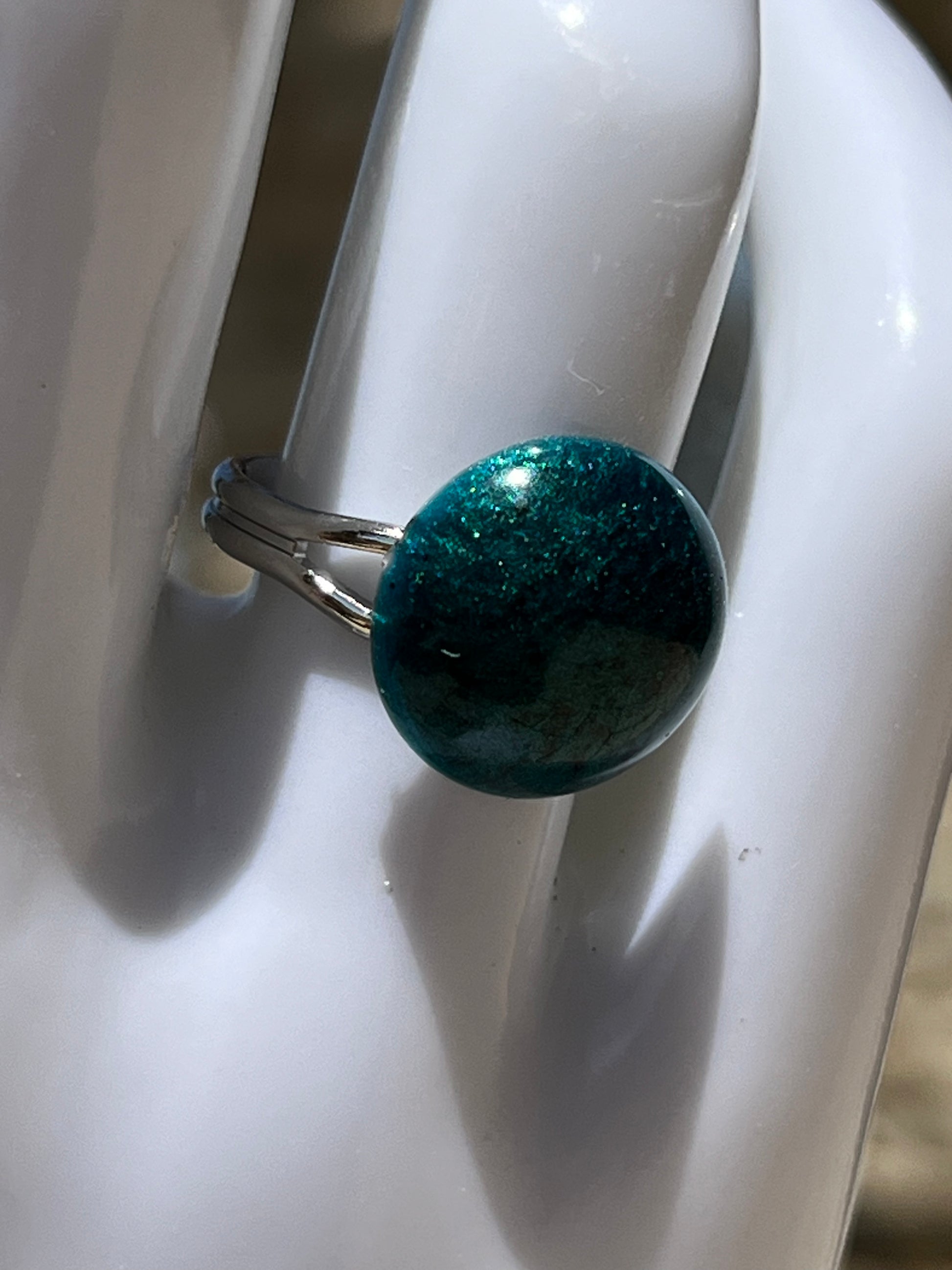 This silver ring features a stunning emerald green gem that is handmade with epoxy. Its classic design and eye-catching detail will add charm to any ensemble.