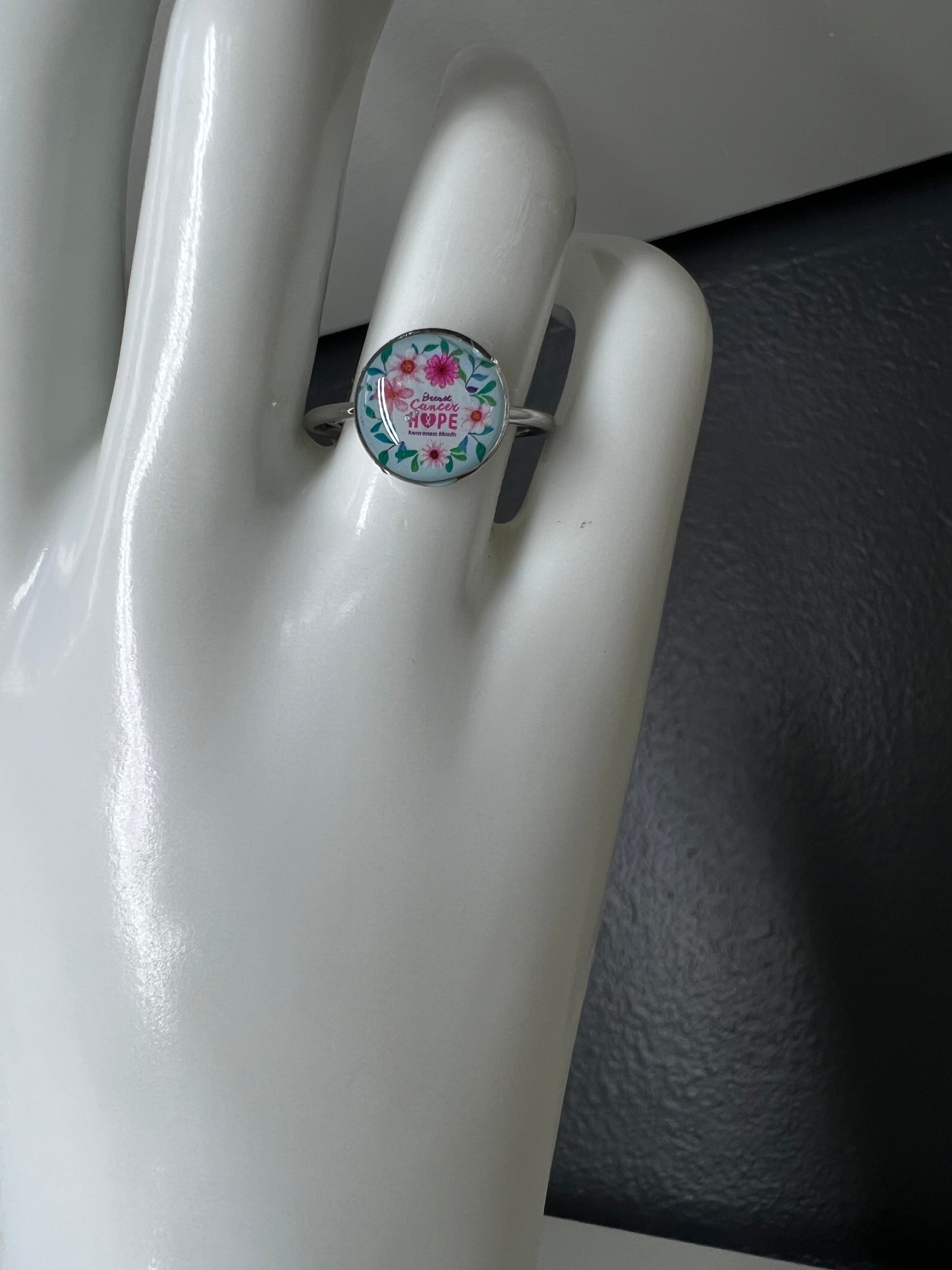 This silver ring features a sky blue background with a heartfelt pink breast cancer uplifting message. An elegant accessory for any outfit, it's a subtle way to show support for those affected by the disease.