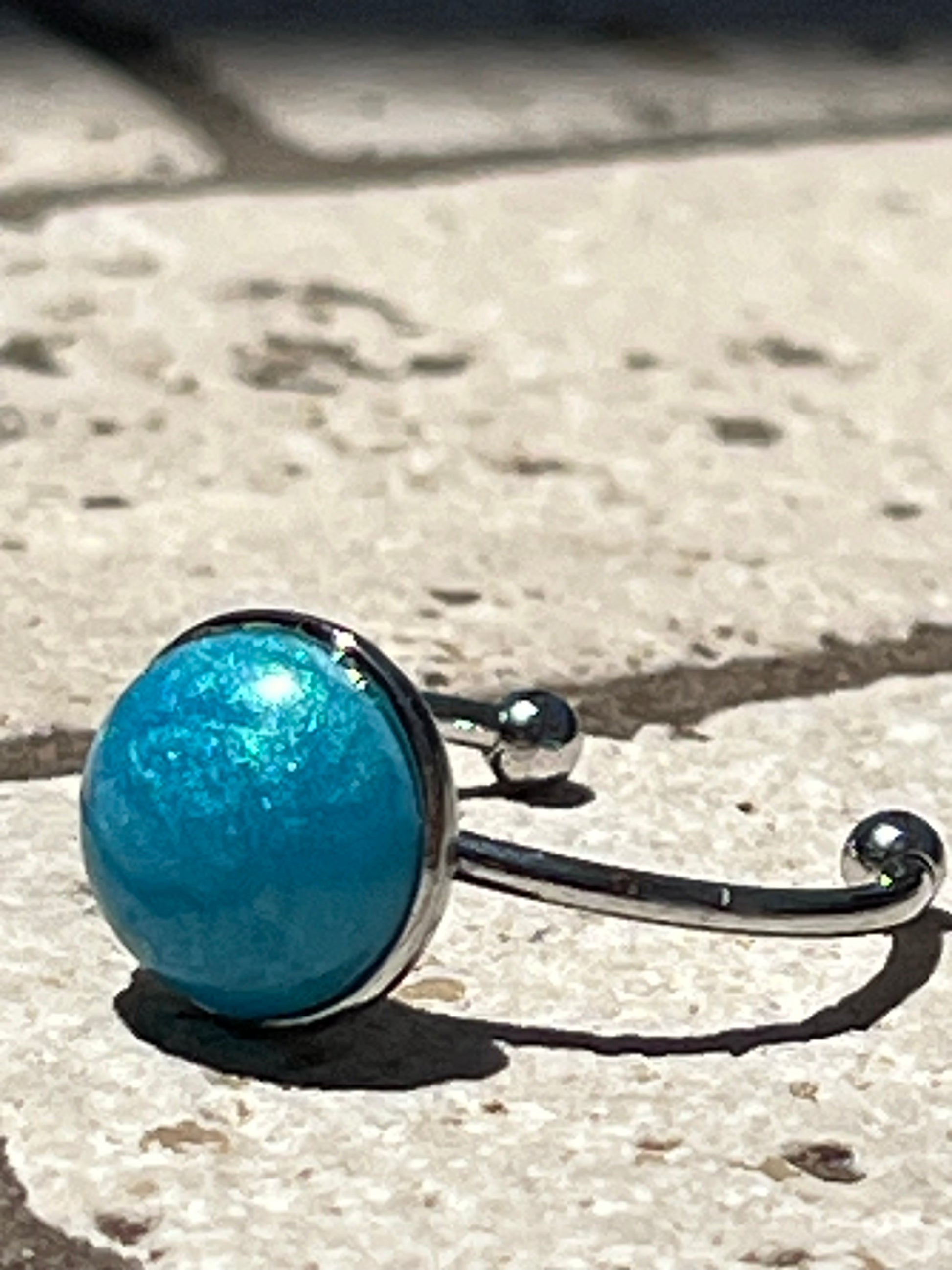 This stunning ring is crafted with a handmade gem made from epoxy and blue colorant, set in a silver band. Its exquisite blue hue and unique design allows you to stand out from the crowd. Perfect for special occasions, this one-of-a-kind piece is sure to make a lasting impression.