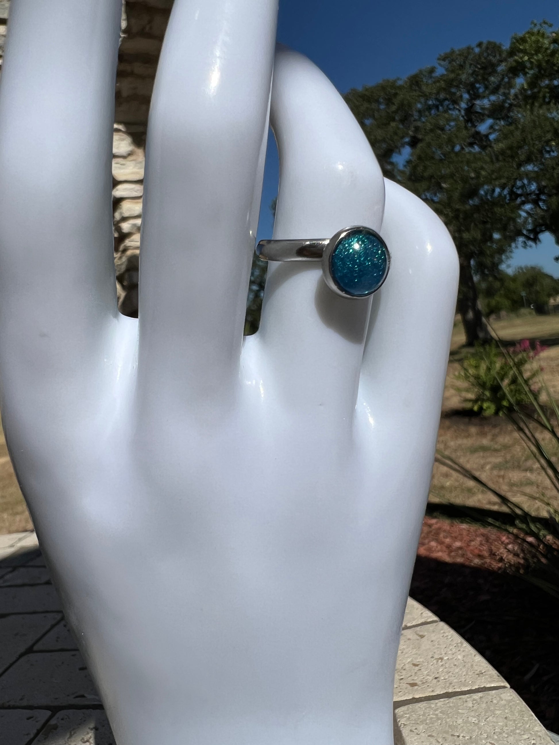 This ravishing Ring is crafted with sterling silver and a handmade turquoise blue gem encased artfully in epoxy. Its intricate design exudes sophistication and style, making it a stunning addition to any collection.