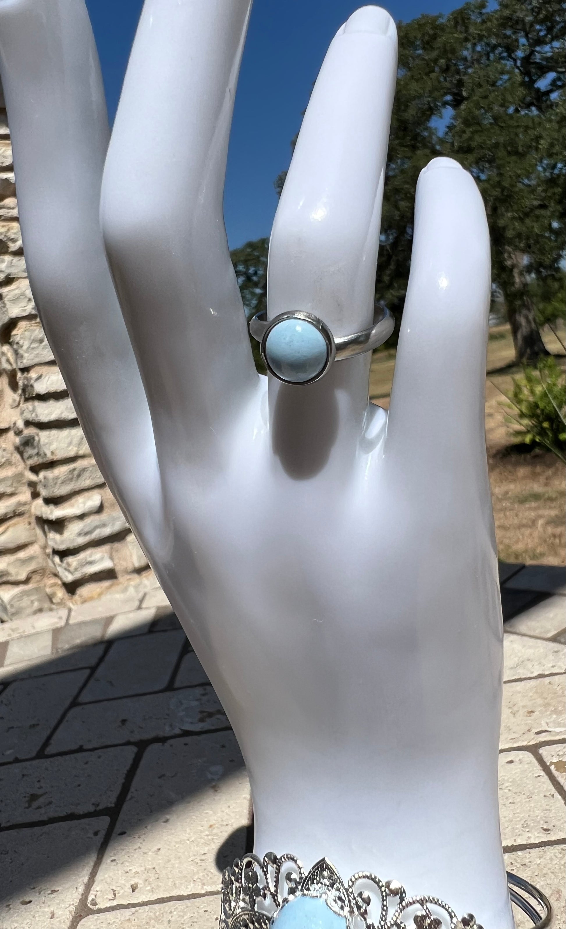 This elegant and eye-catching ring is the perfect accessory for any occasion. The beautiful silver adjustable band features a handmade gem of epoxy in a shiny light blue and opal combination. It offers a sophisticated look with classic style.