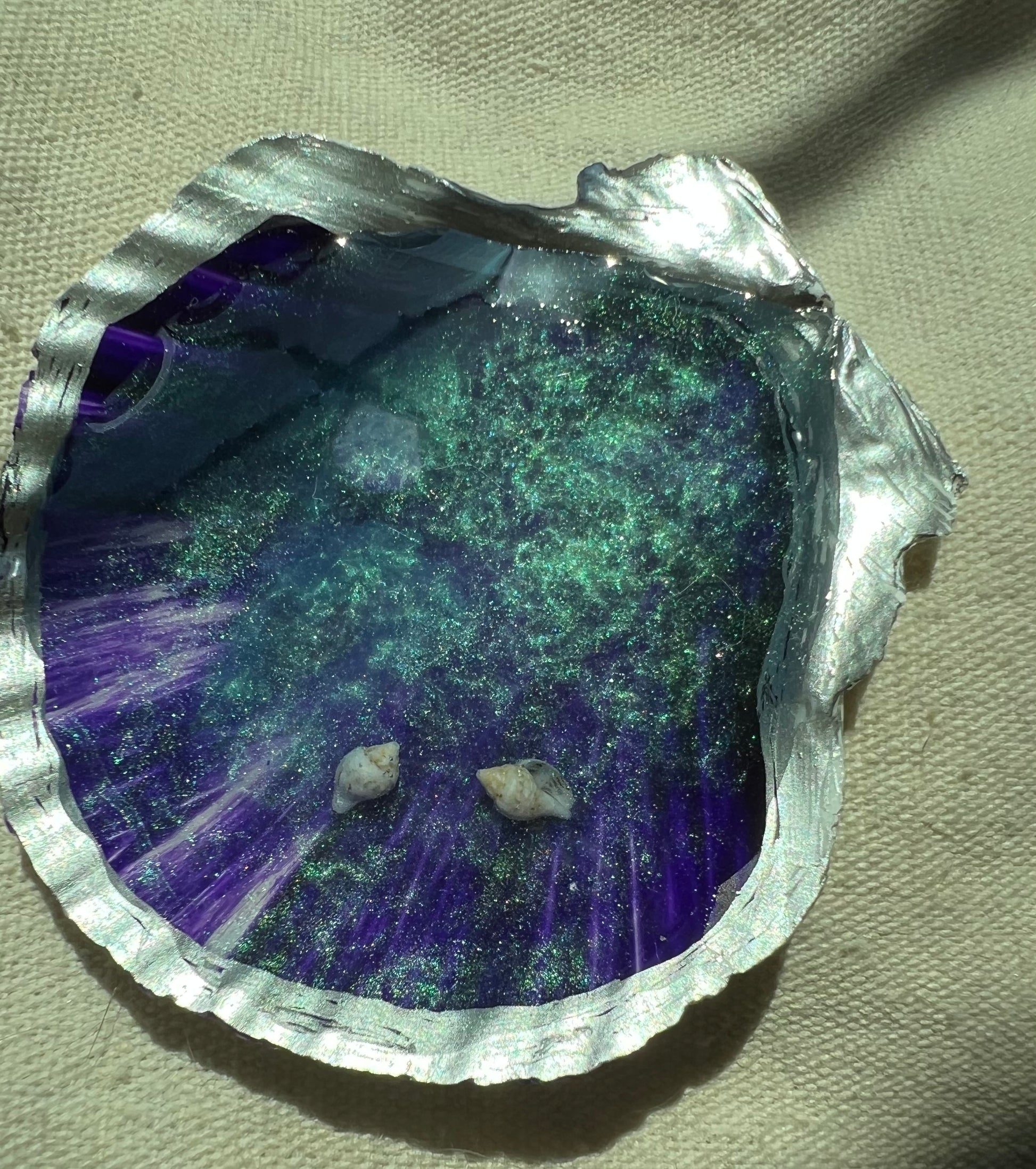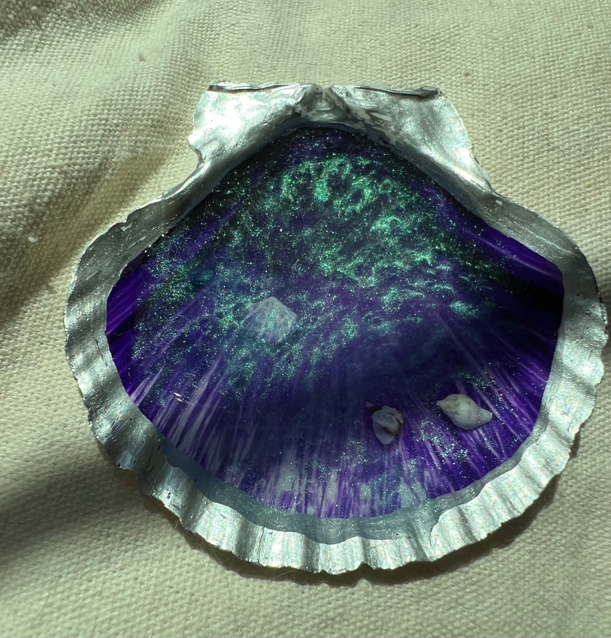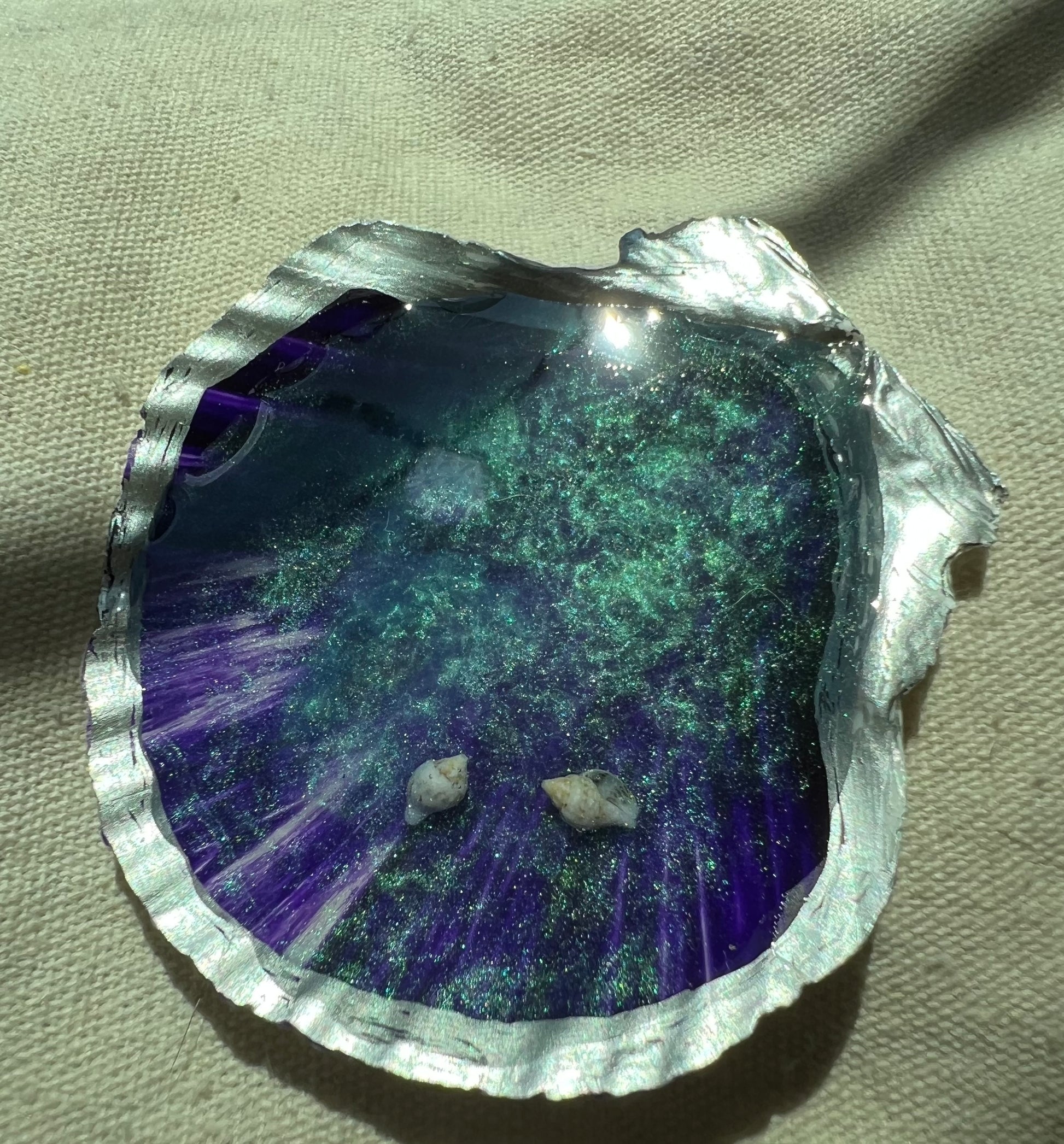 This handmade ring holder features a unique combination of a small shell and beautiful purple mixture all encased in epoxy. Its size makes it ideal for holding and displaying rings or other small items. Its eye-catching design will add a unique and stylish accent to your home.