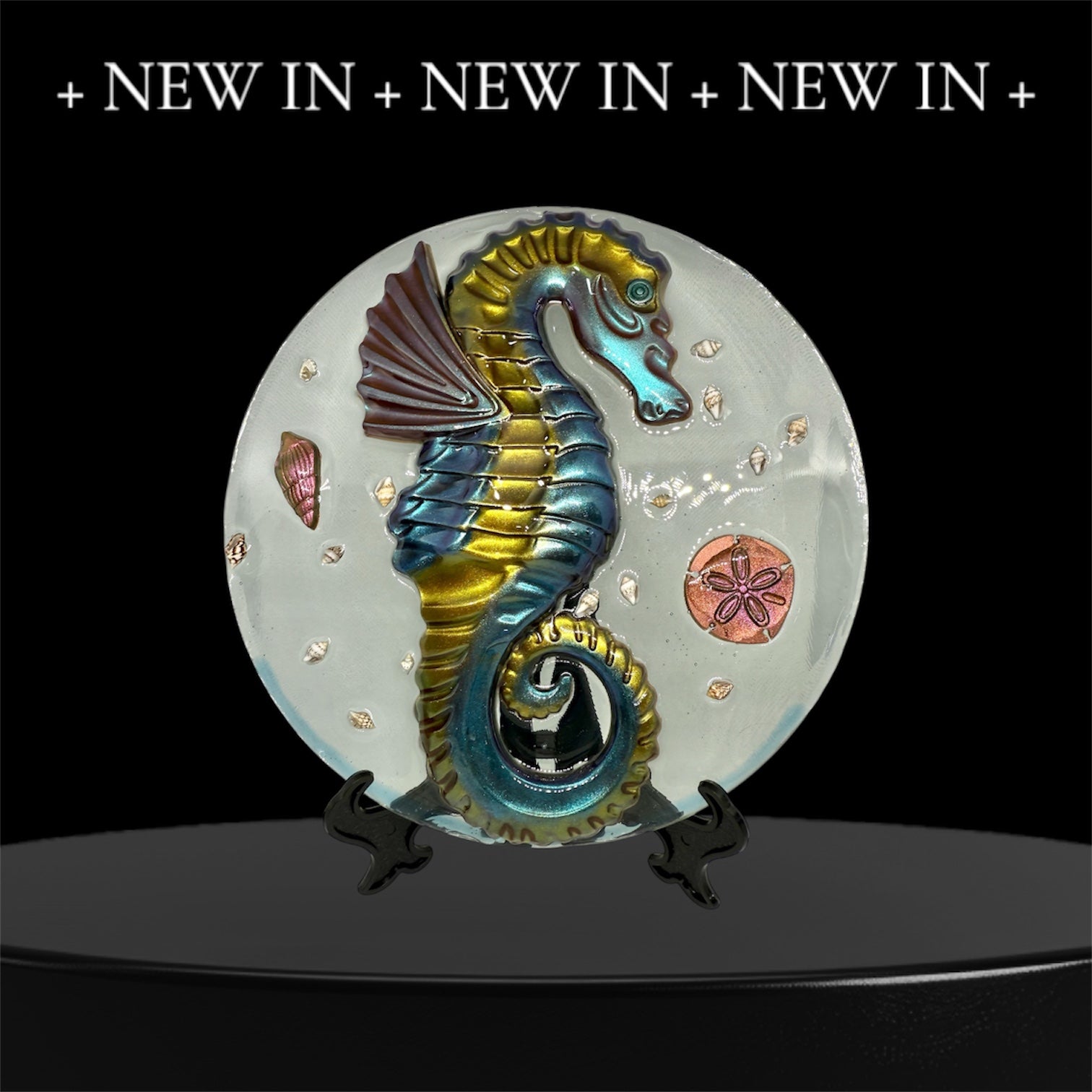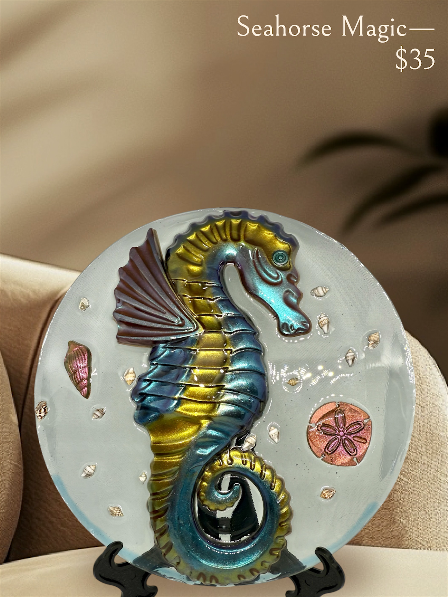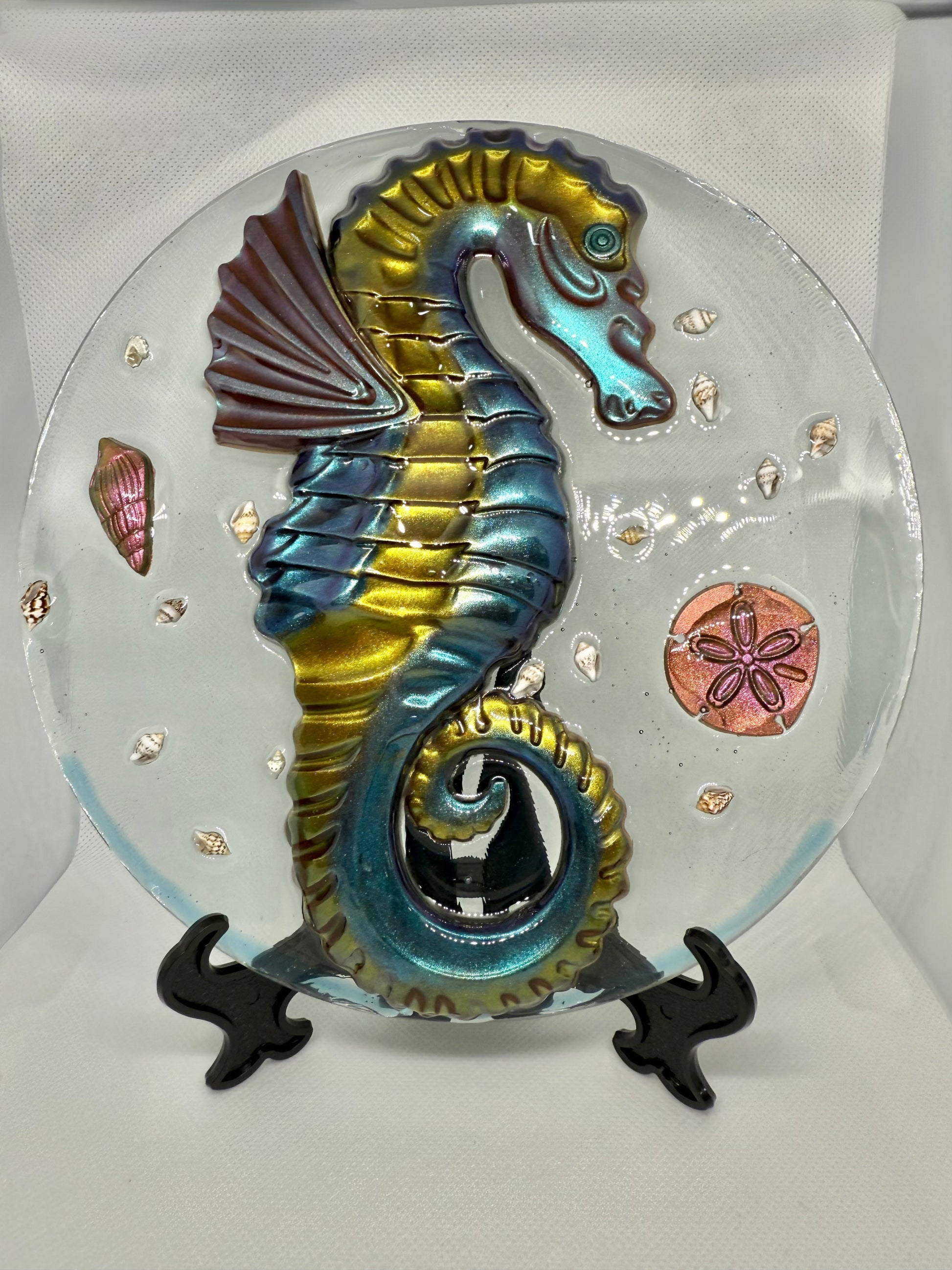 This large seahorse sculpture is expertly crafted from epoxy resin, featuring sea shells also made from epoxy. It displays a beautiful blend of color-changing mica pigments, creating a unique, dynamic appearance. The seahorse and shells are elegantly presented on an 8-inch round glass plate, enhancing their visual impact. Each piece is one of a kind and includes a display stand for a refined presentation.