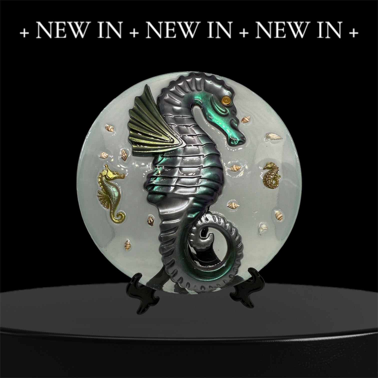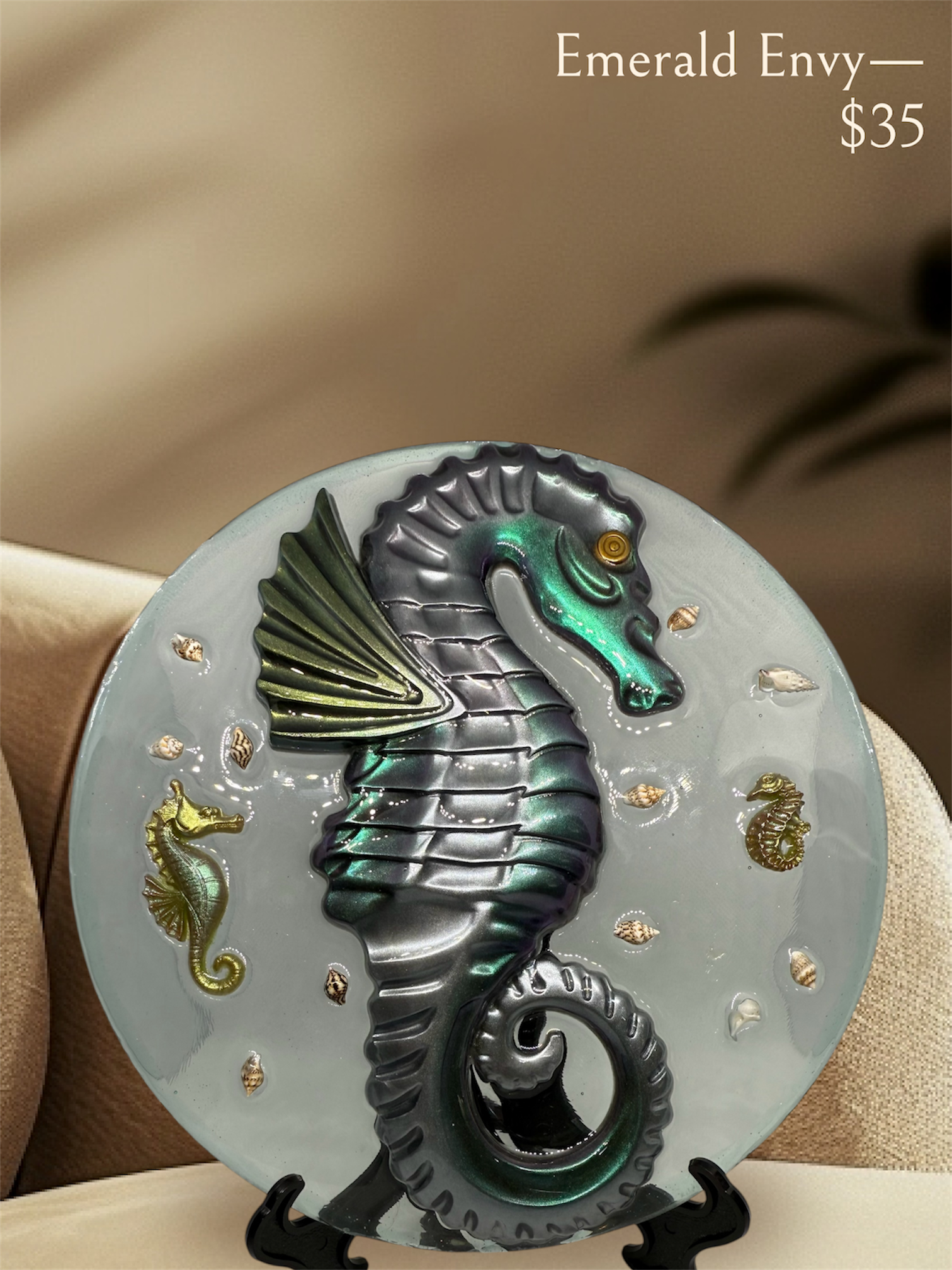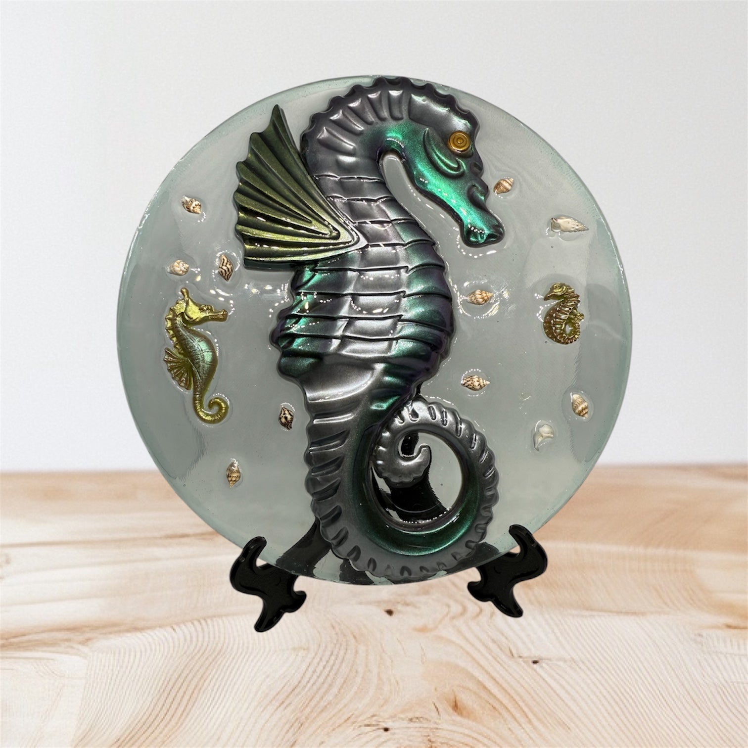 This unique 8-inch round plate features a large seahorse centerpiece accompanied by two smaller seahorses, all crafted with epoxy resin. Accented with a few delicate real shells and enhanced by beautiful color-changing mica pigments, this one-of-a-kind piece captures the essence of the ocean. Perfect for ocean lovers seeking an elegant and artistic display. This comes with a small stand.