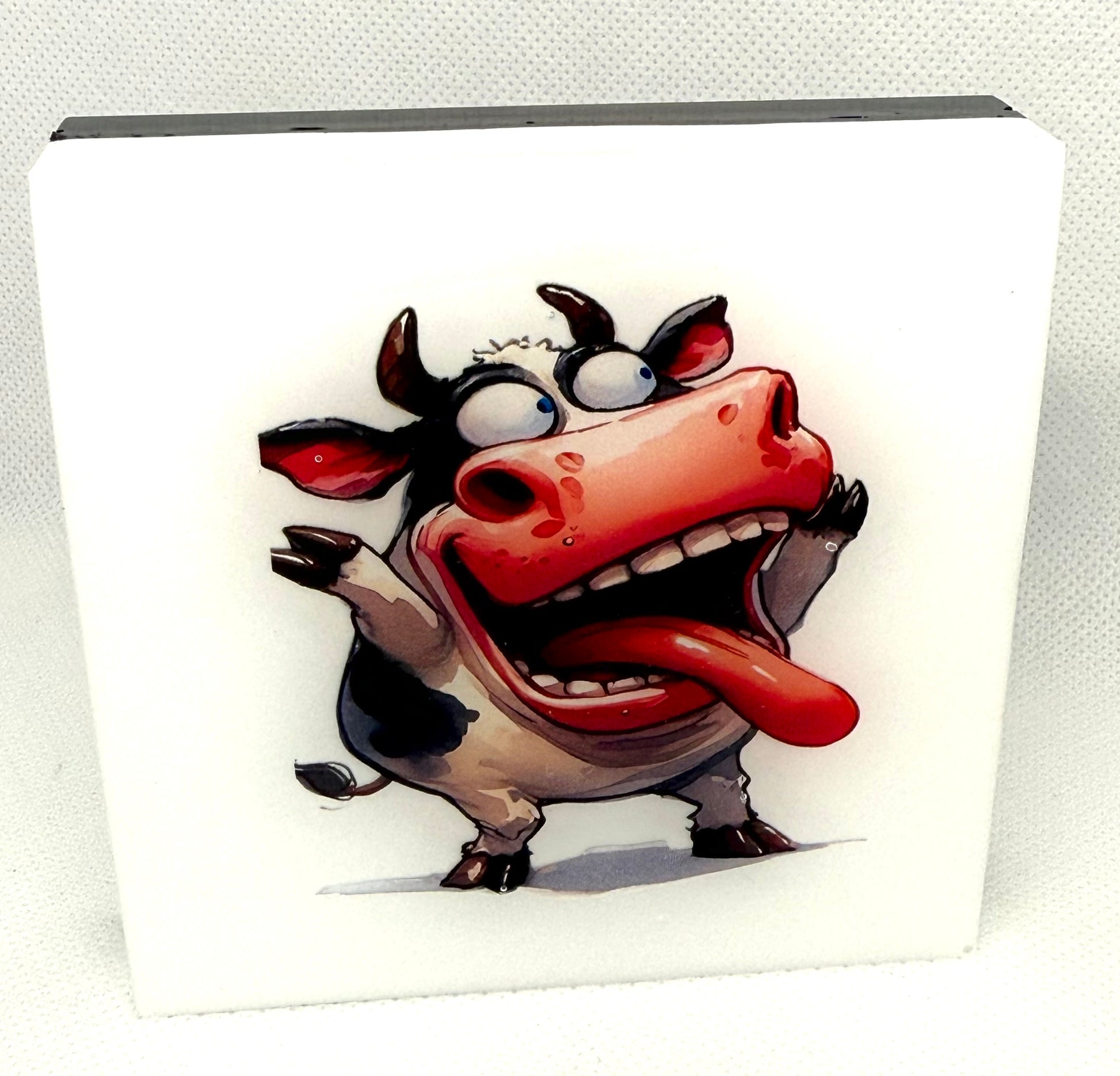 Crafted from durable epoxy resin, the Silly Cow Coaster features a charming cow face that brightens any space. Designed as a large single coaster, it effectively protects surfaces from moisture while adding a playful touch. Its sturdy build also makes it suitable as a paper holder, ideal for teachers or office use. This multifunctional accessory combines practicality with a cheerful design to bring a smile every time you see it.