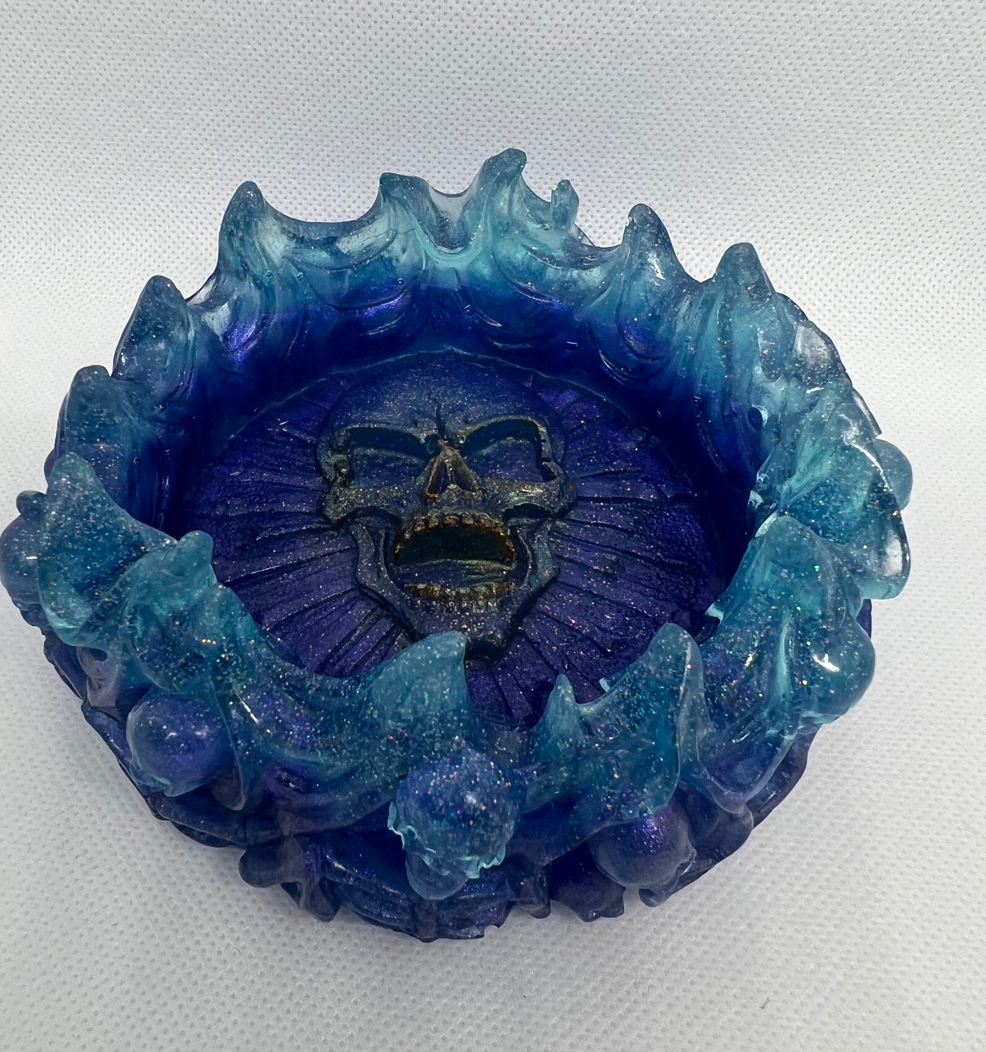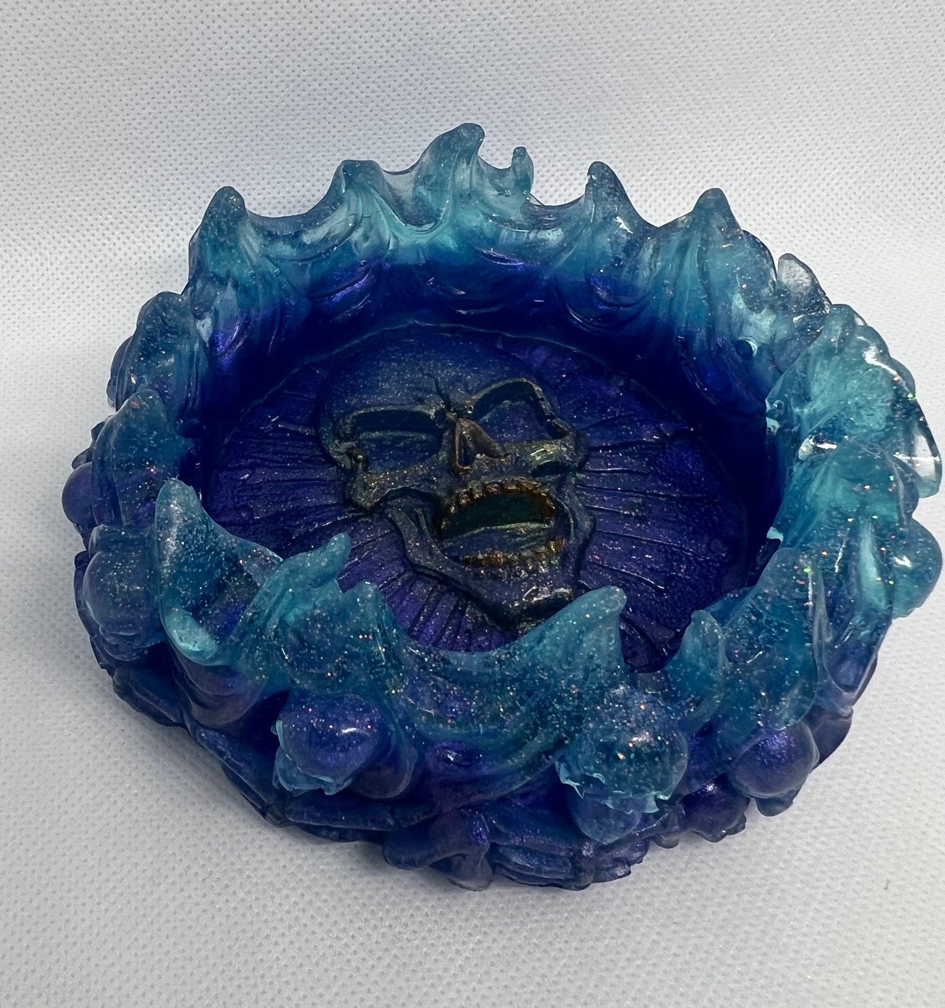 Made with durable and unique epoxy resin, this Skull Bowl is perfect for Halloween lovers. Featuring a stunning design with small skulls lining the outside and a large skull in the center, this purple and aqua bowl adds a spooky touch to any setting. Get yours today and impress your guests!