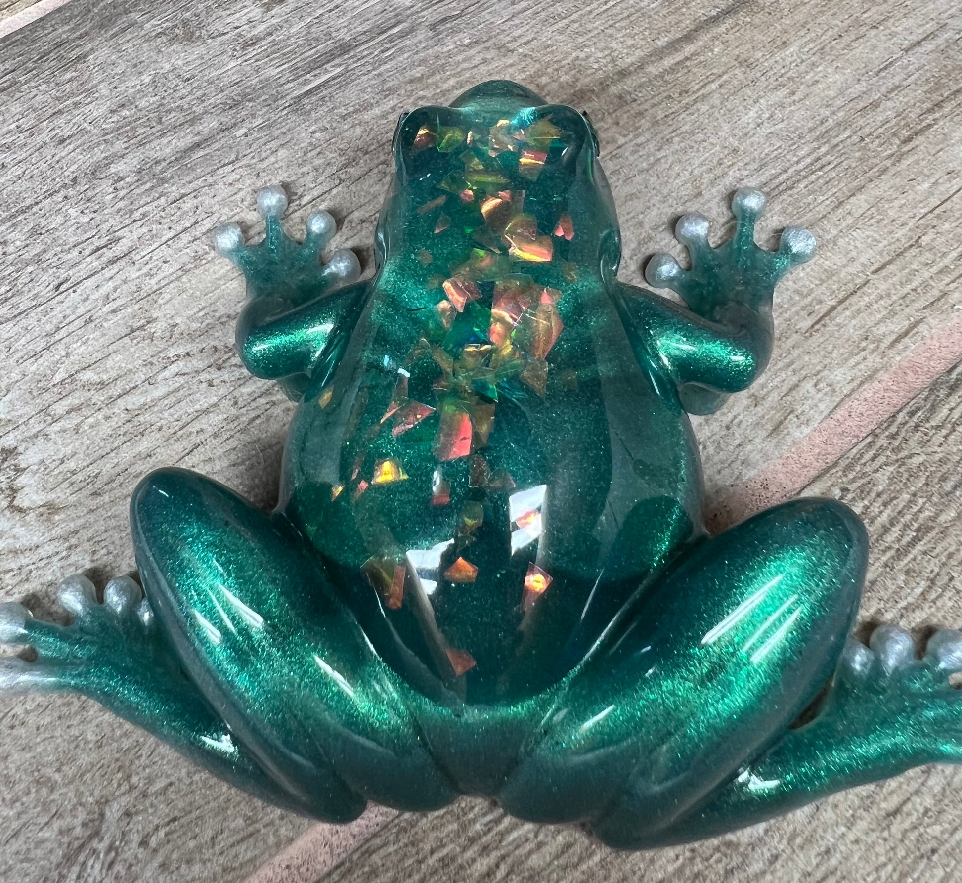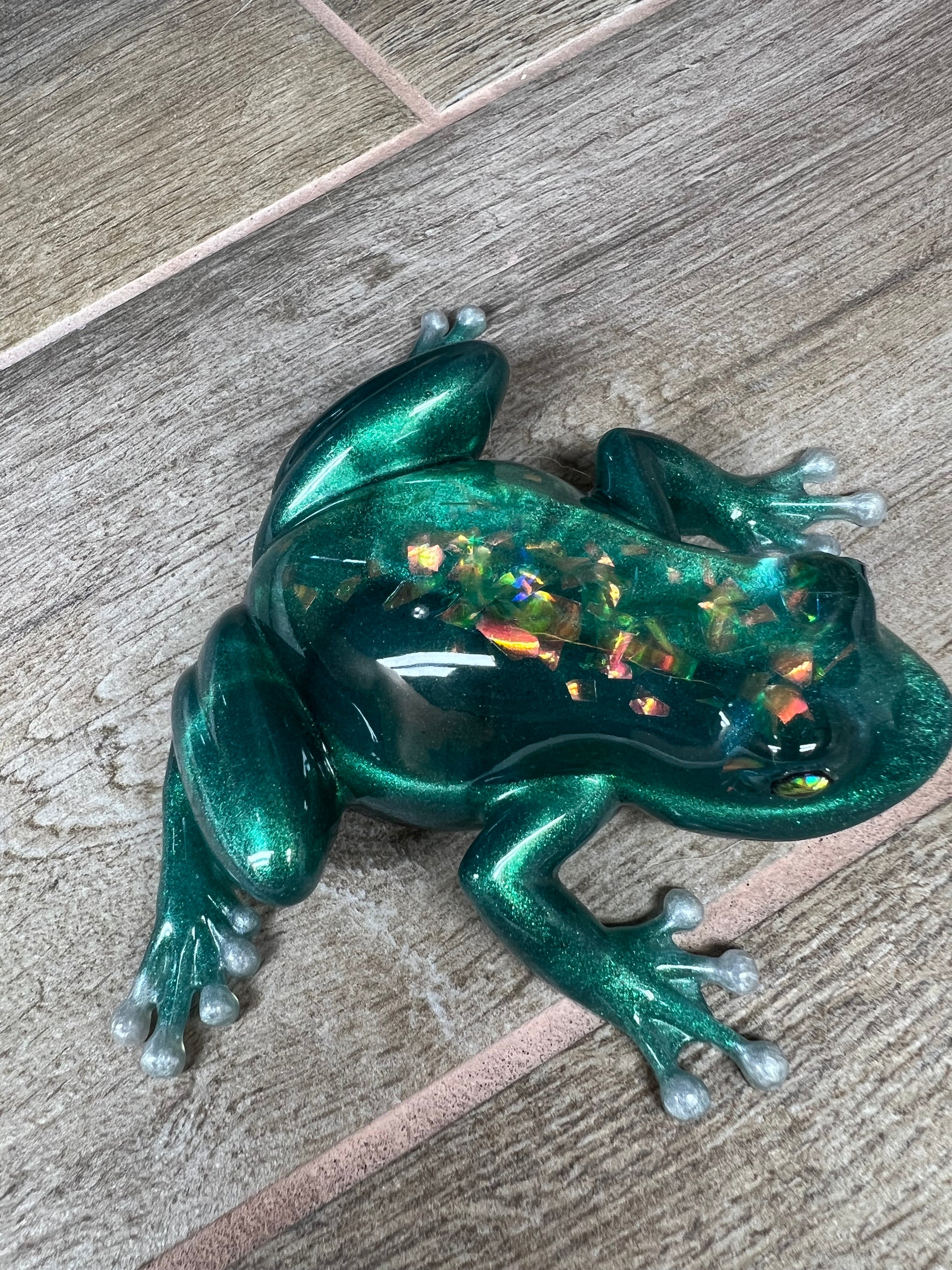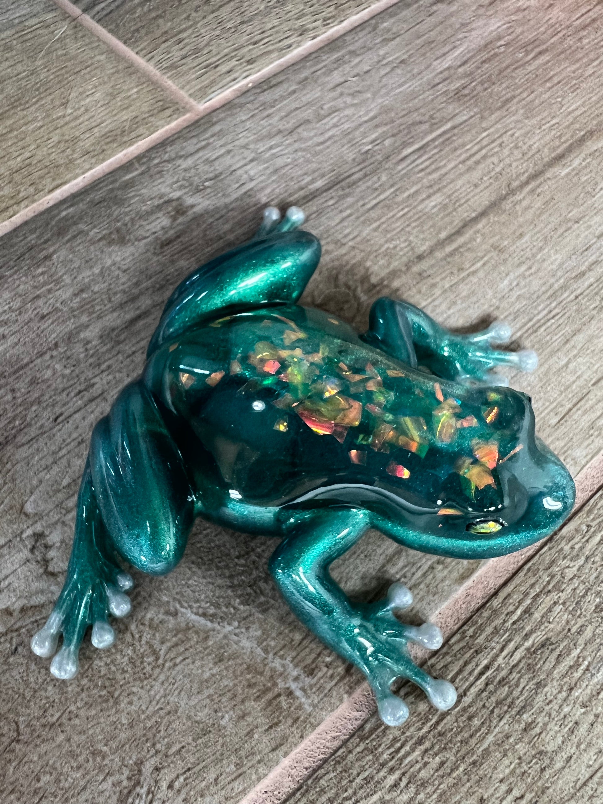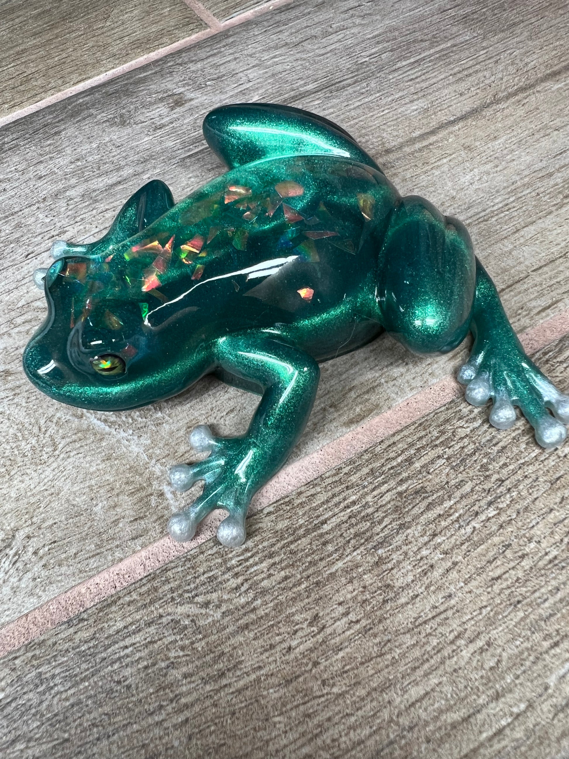 Expertly handmade with high-quality epoxy resin, this adorable green frog figurine boasts a sparkling back, making it a unique addition to any home or office decor. Guaranteed to catch attention and spark conversation, this one-of-a-kind piece is a must-have for any frog lover.