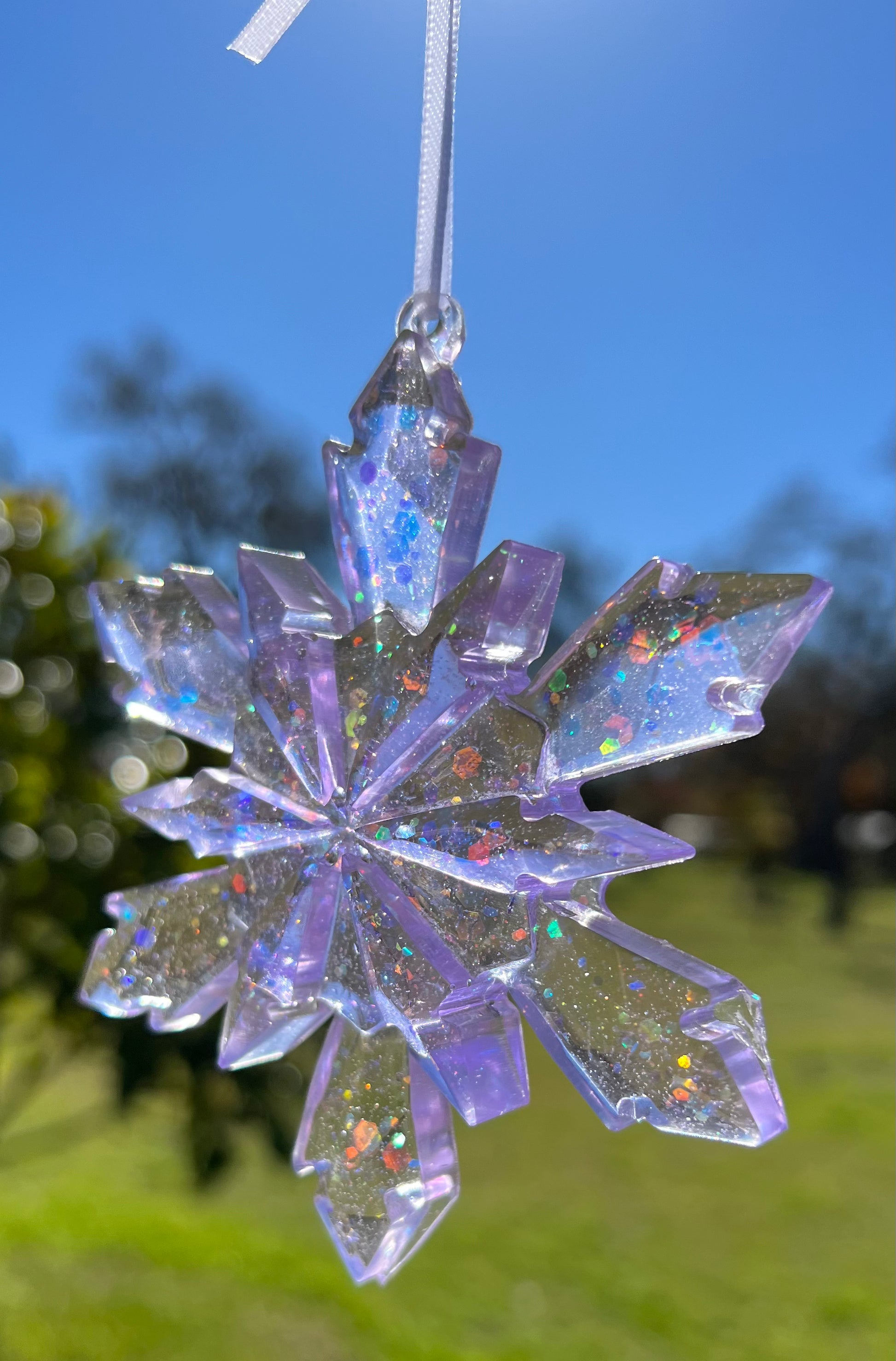 This handmade, one-of-a-kind Sparkling Purple Snowflake is made with epoxy for a beautiful shimmering effect. Its light purple hue is sure to draw attention and delight.
