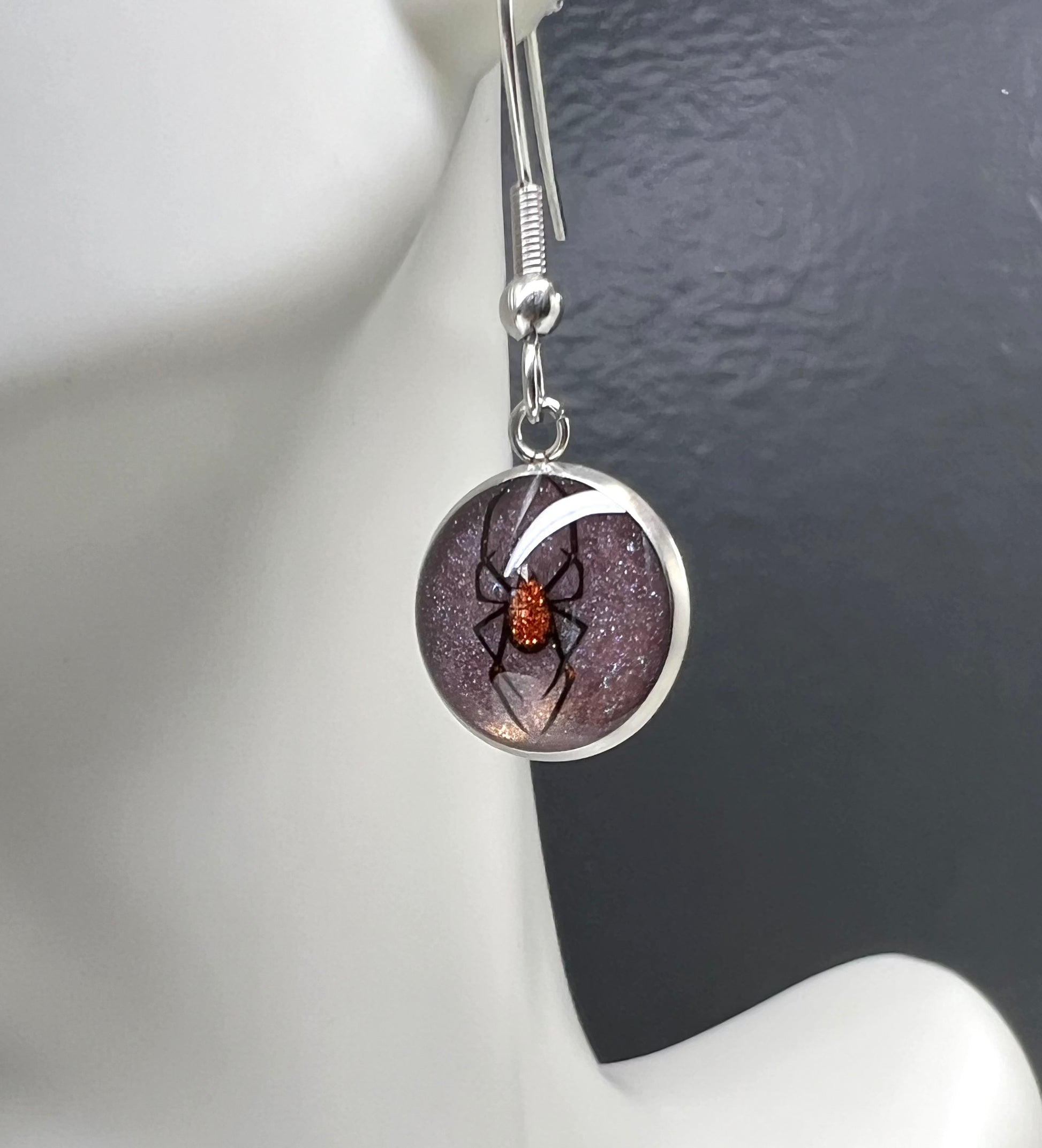Elevate your Halloween look with our Spider Earrings! These epoxy earrings feature a subtle purple tint and a sparkling spider in the center, perfect for adding a spooky touch to any outfit. Get into the spirit of the season with these stylish and unique earrings.