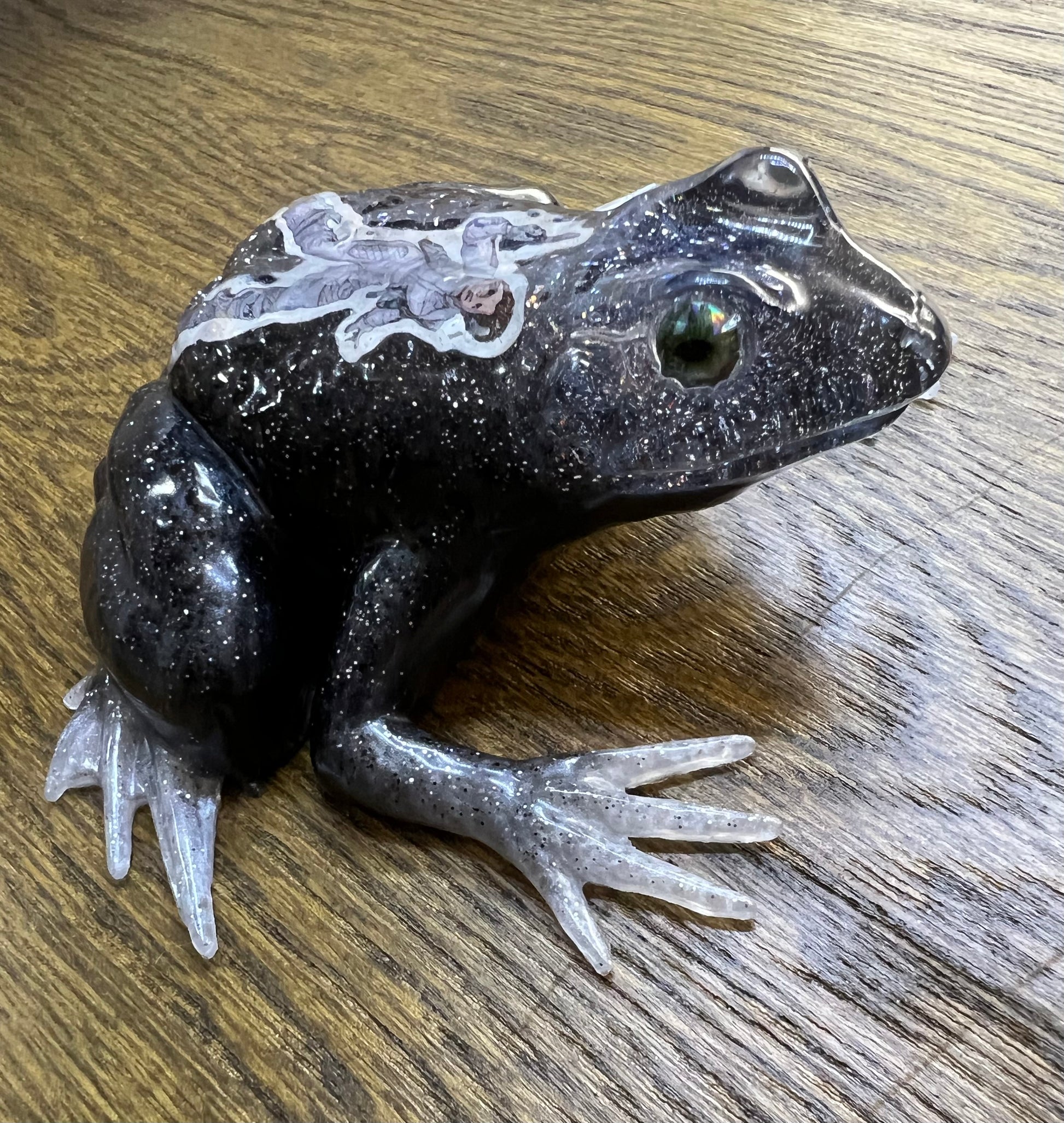 Introducing the one-of-a-kind Star Wars Frog - the perfect addition to your year-round home decor. Handmade with sparkling black and silver epoxy resin, each adorable frog features a unique Star Wars picture on the back. Perfect for Star Wars fans, this is a must-have collectible for any fan.