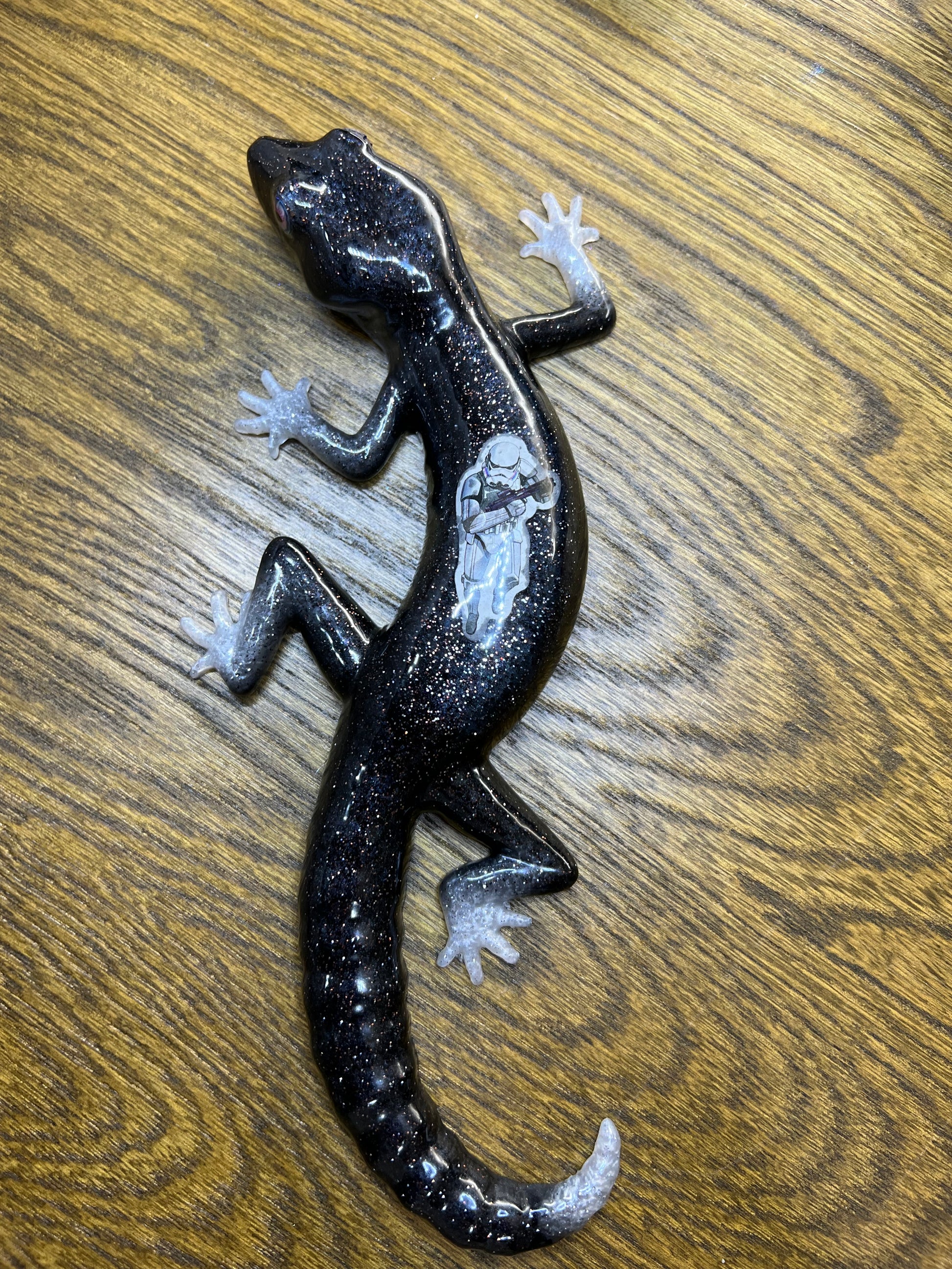 Expertly handmade with durable epoxy resin, this one-of-a-kind lizard figurine features a sparkling black and silver design. A must-have for any Star Wars fan, it's the perfect decor piece to add a touch of sci-fi to any room. Don't miss out on this unique collector's item.
