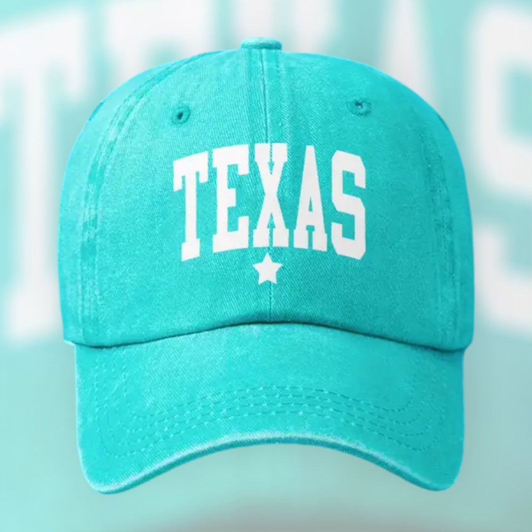 Expertly crafted in cotton, this Texas Baseball Hat in lake green is perfect for showing off your Texas pride. With "TEXAS" boldly printed on the front, this cool colored hat not only makes a statement, but also provides great sun protection. A must-have for any Texan!