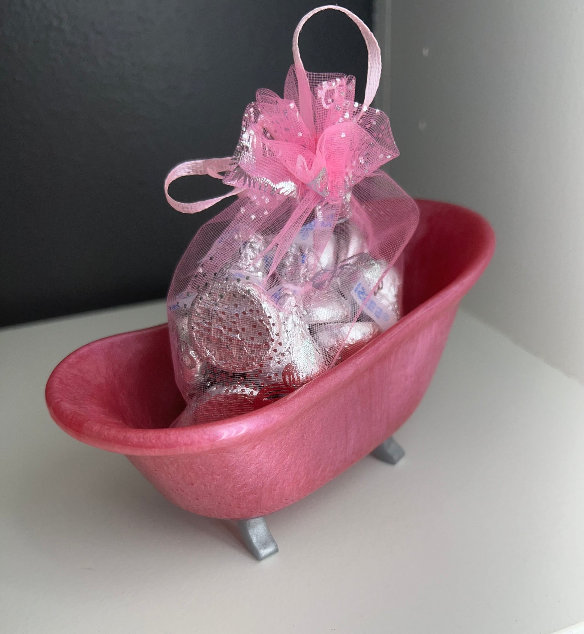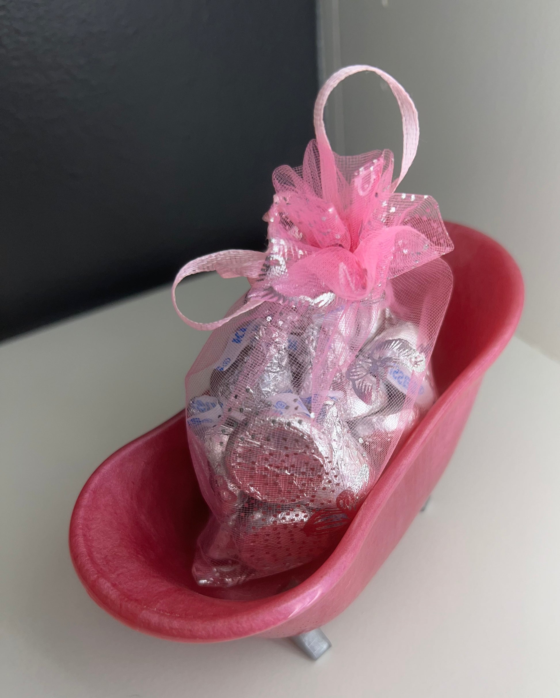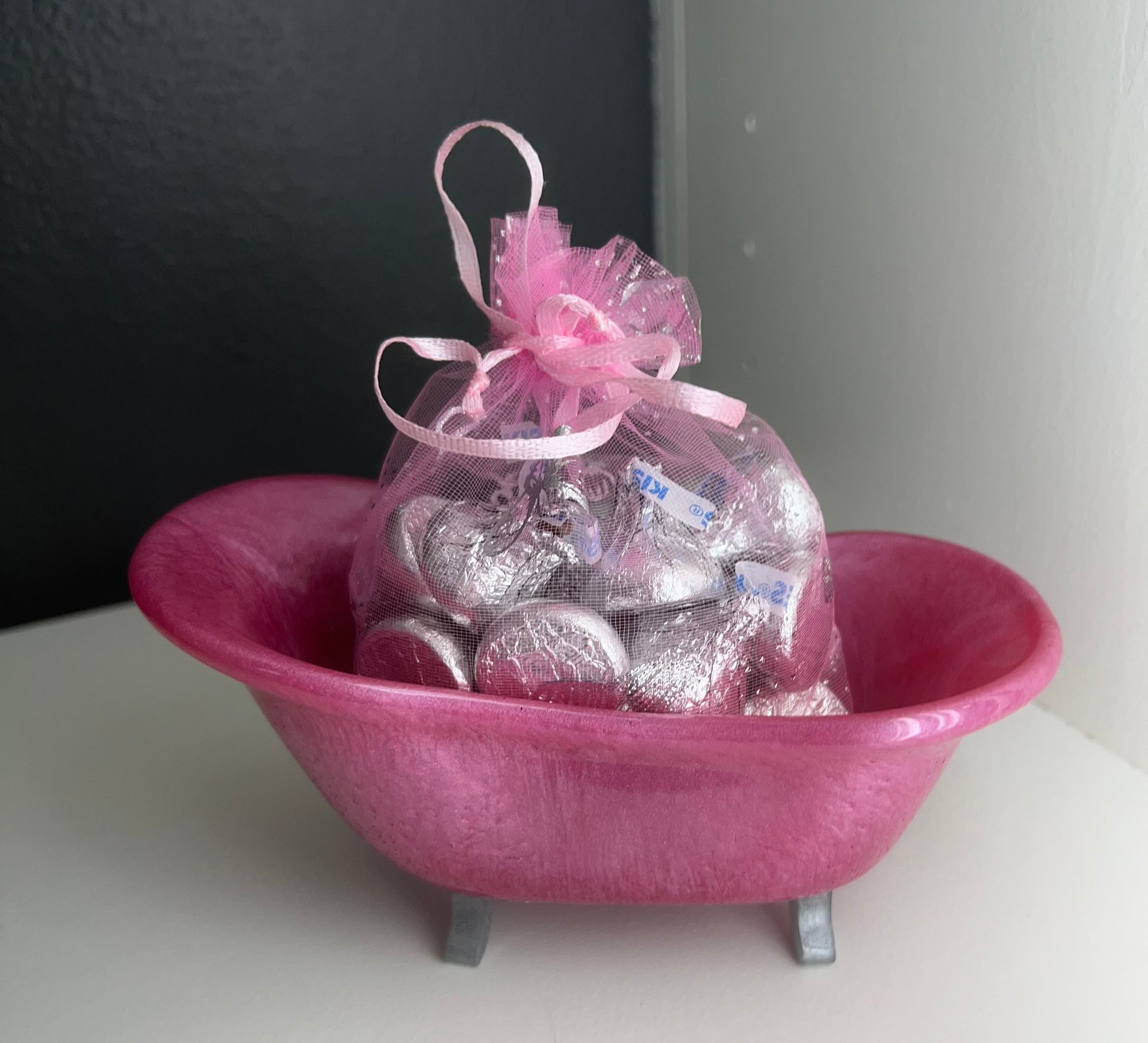 This poppy red epoxy tub is perfect for your loved one. The inner bag is filled with delicious Hershey kisses, providing a sweet surprise. Feel confident in the quality of this tub, designed for love and expertly crafted for a memorable gift.