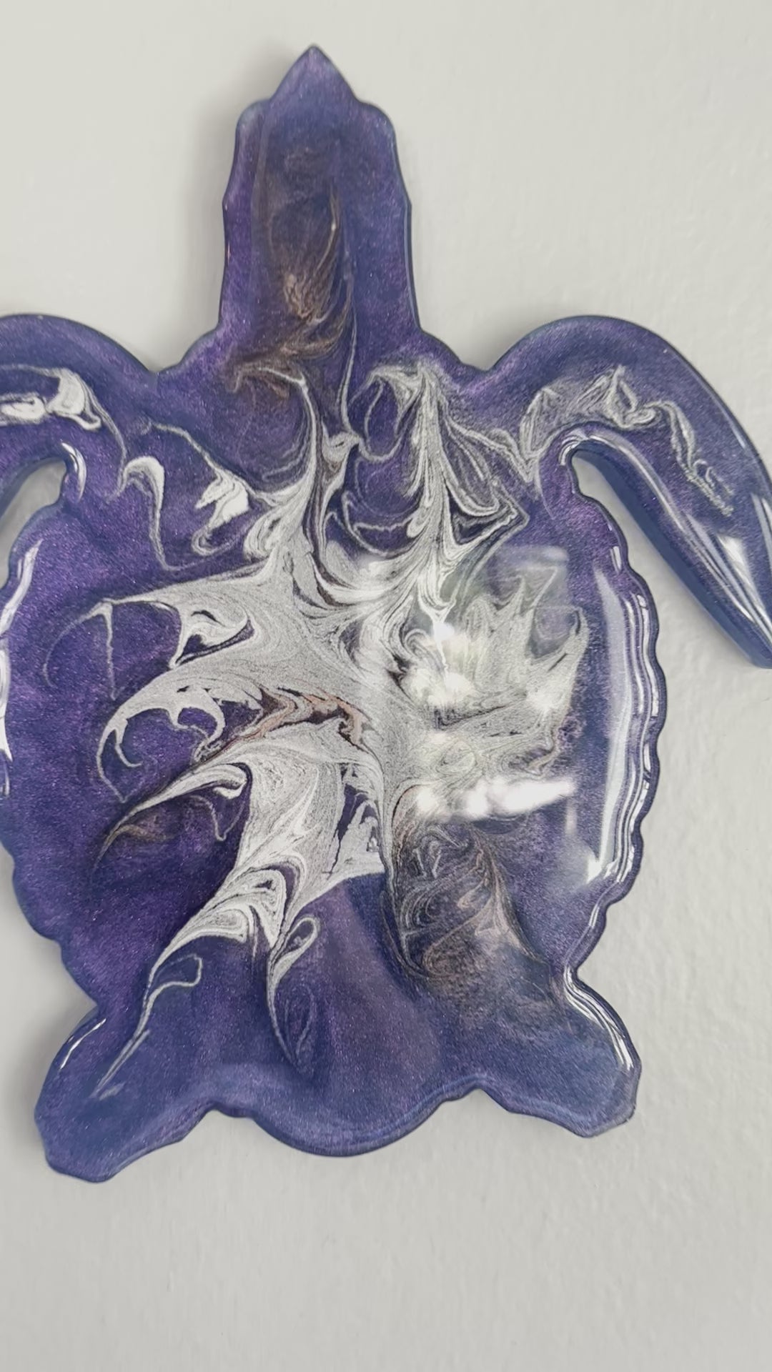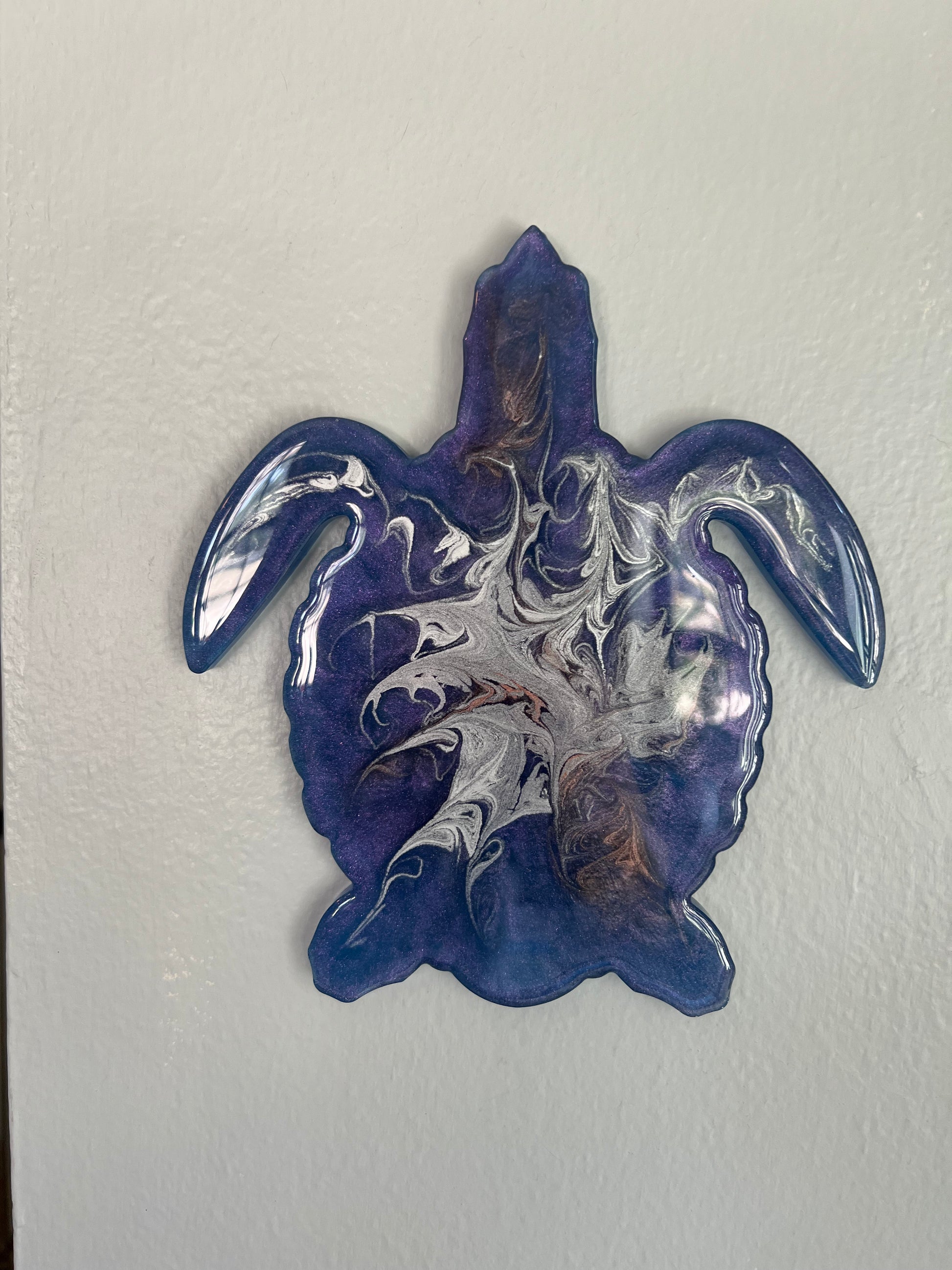 This one-of-a-kind turtle is handmade with epoxy and finished with purple, silver, and gold highlights. Its beautiful design makes it the perfect home decor piece. Add an elegant touch to your living spaces with this unique and eye-catching piece.