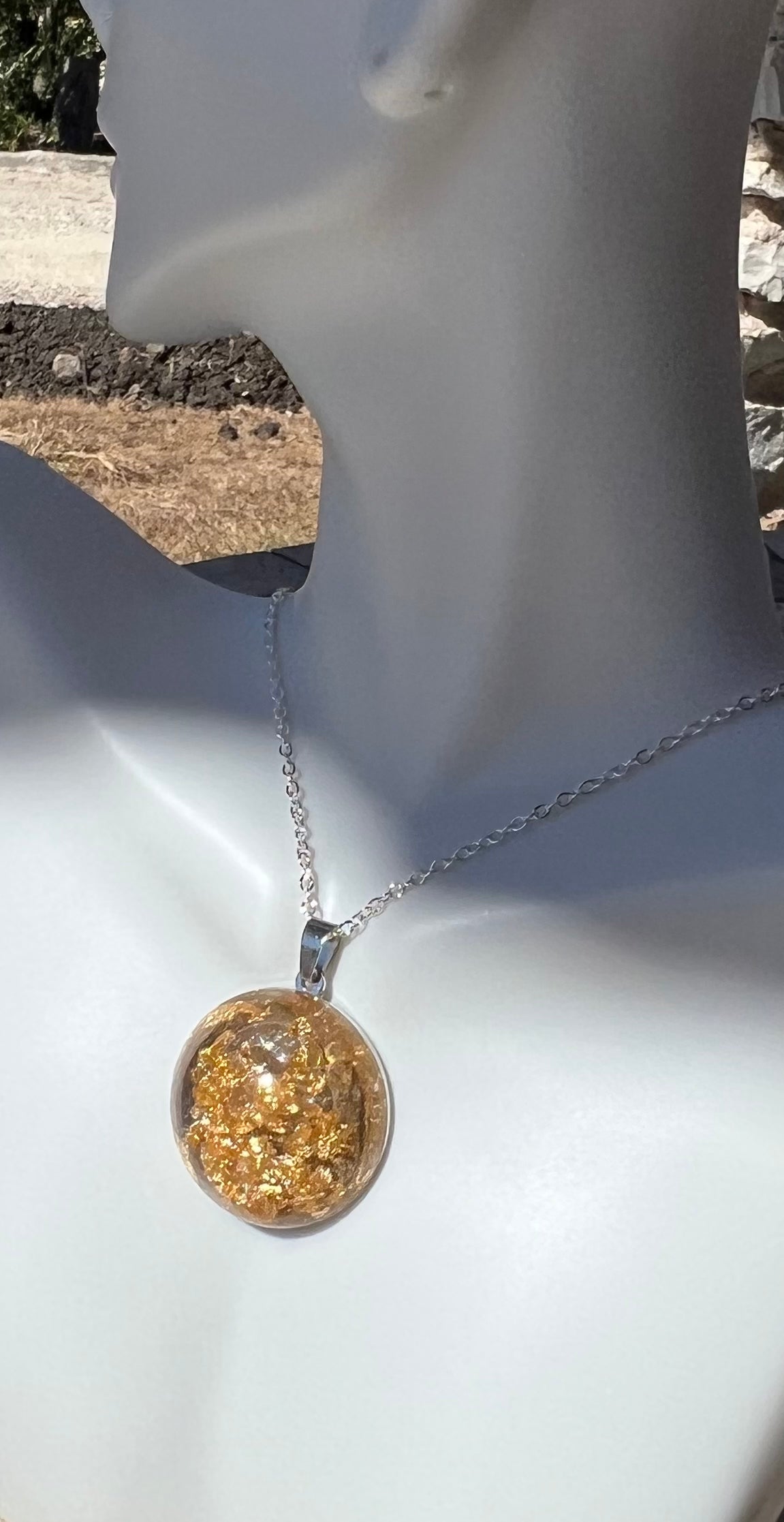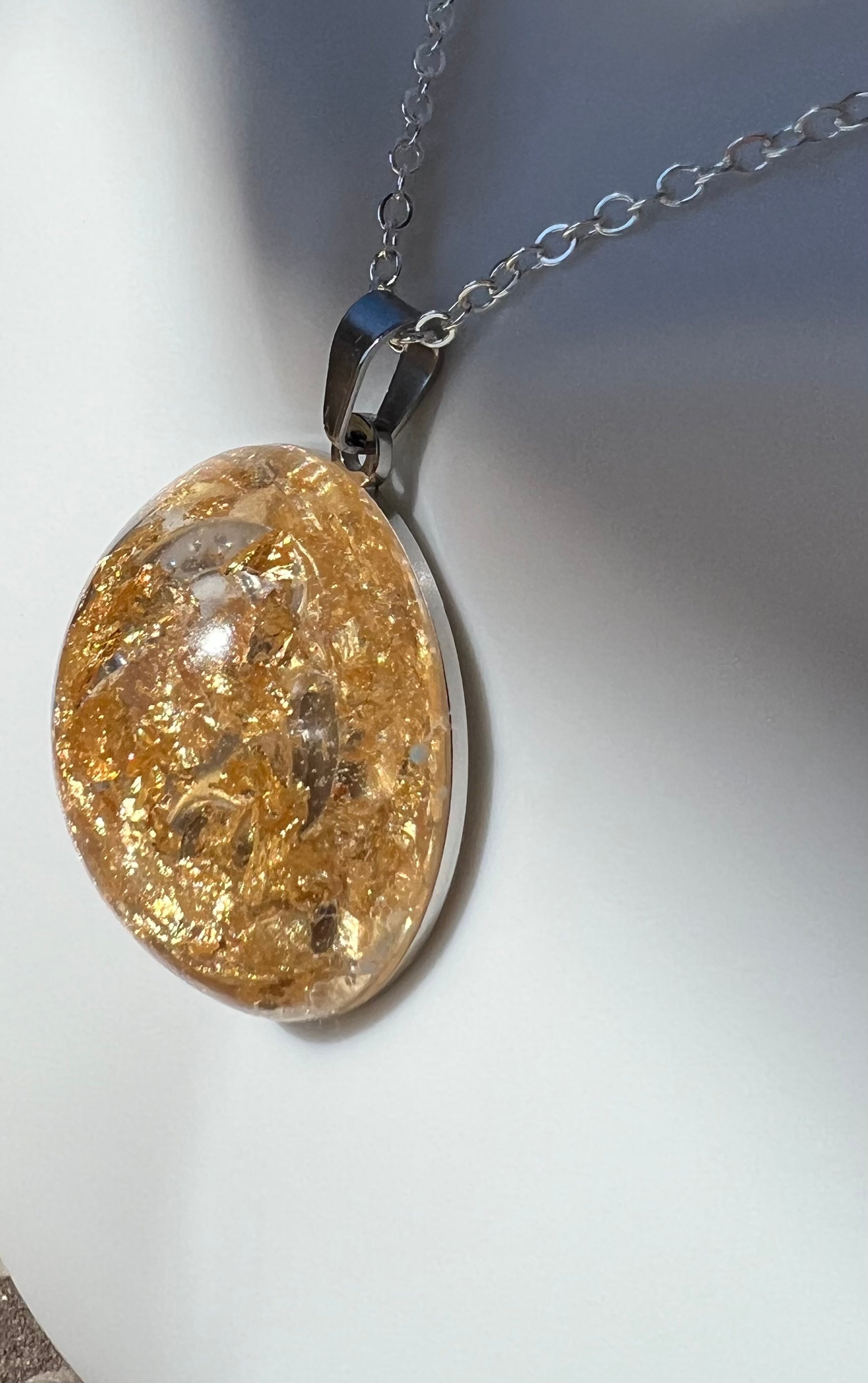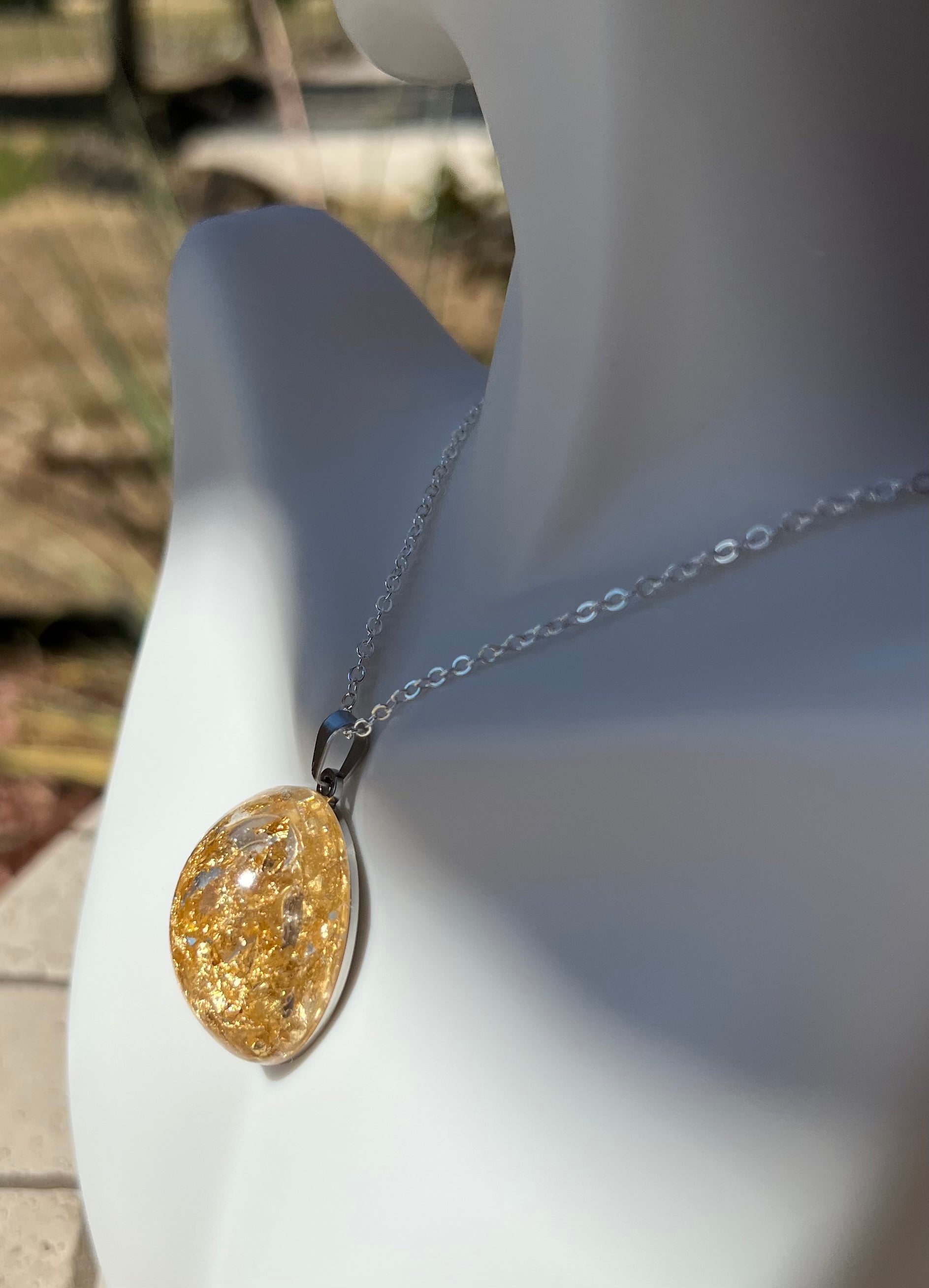 Capture a unique statement with this one-of-a-kind necklace. Crafted with a silver chain and a handmade gem, this classy accessory is designed with epoxy and gold flakes to create a bold look. Wear it day or night for an unforgettable piece.