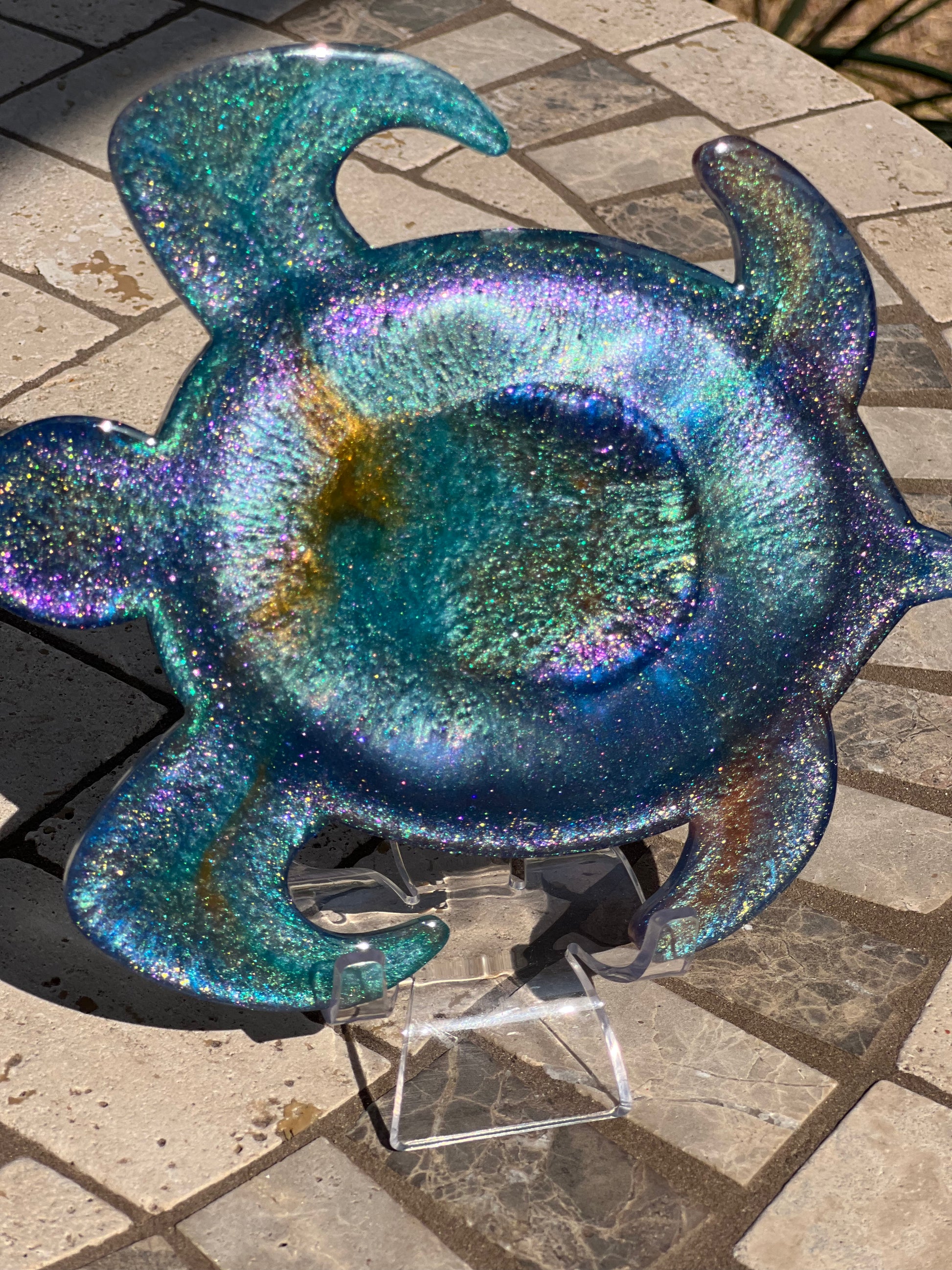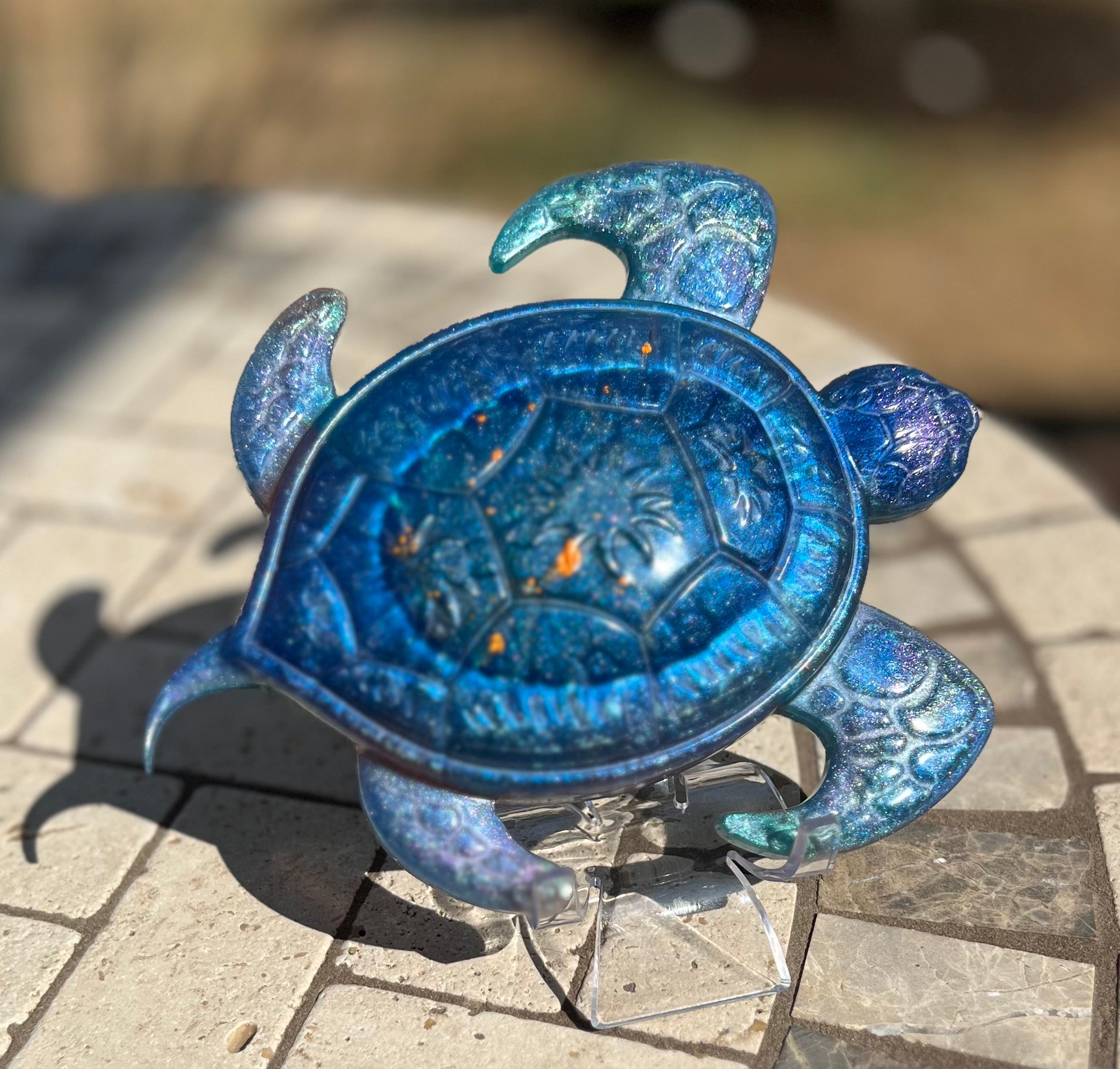 Add a unique touch to your home decor with this handmade epoxy turtle. A stunning blend of blues, greens and orange make this one of a kind piece an eye-catching addition. Bring the beauty of nature indoors with this beautiful home decor accent.