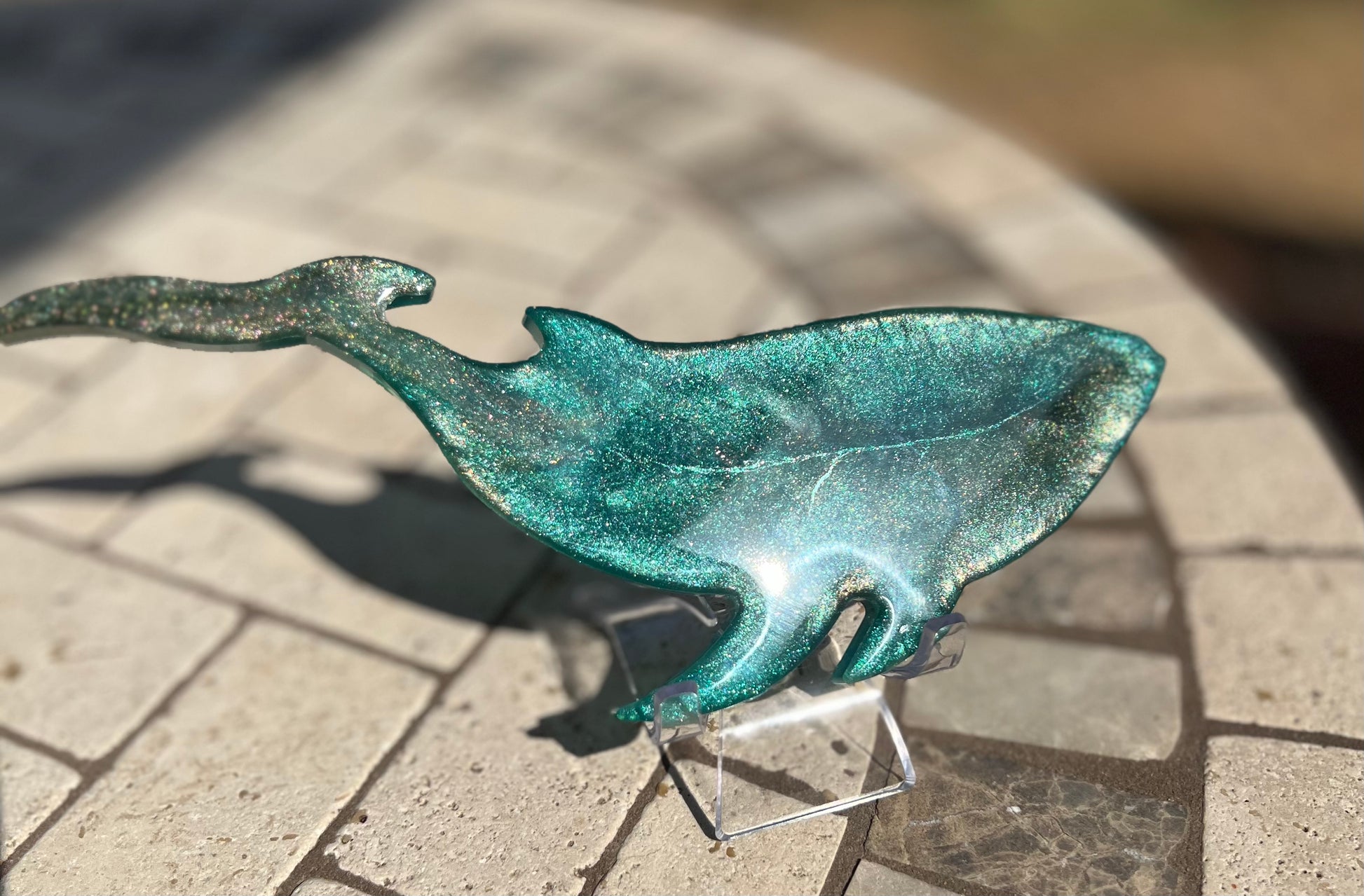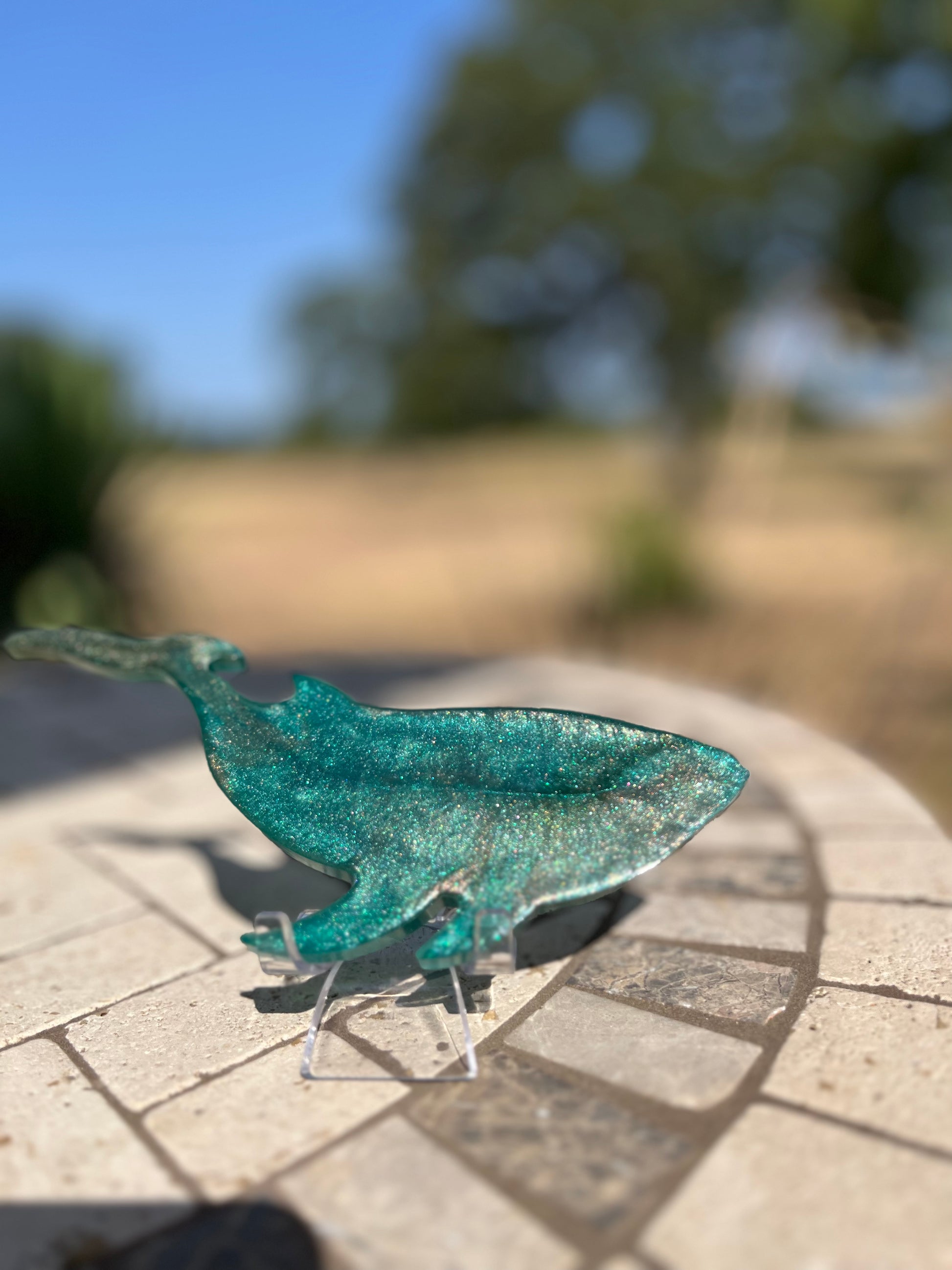 Bring the beauty of the sea to your home with this eye-catching handcrafted Whale. Made with epoxy and a unique blend of green and gold, this decor piece offers texture and sparkle to any space. Perfect for any ocean lover.