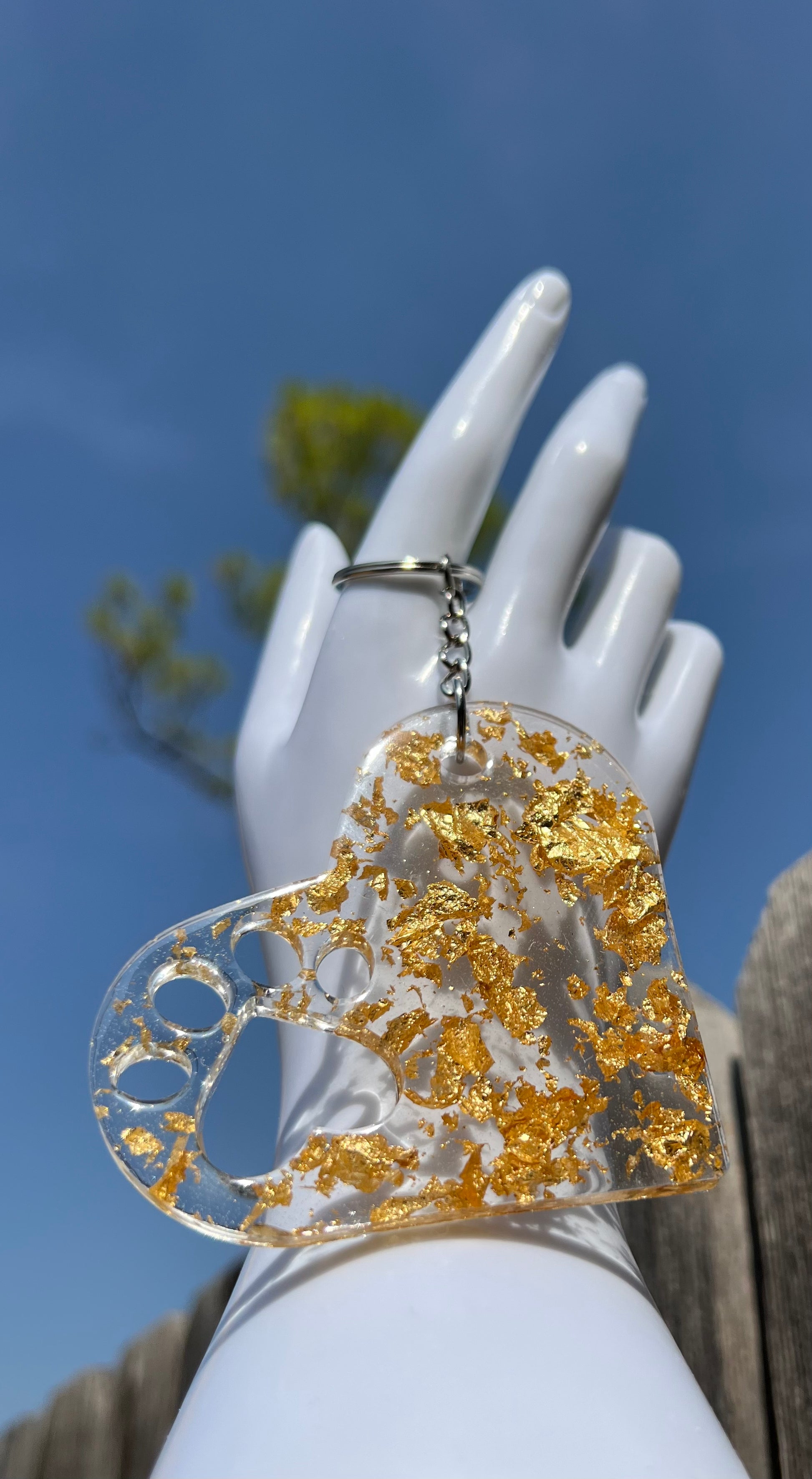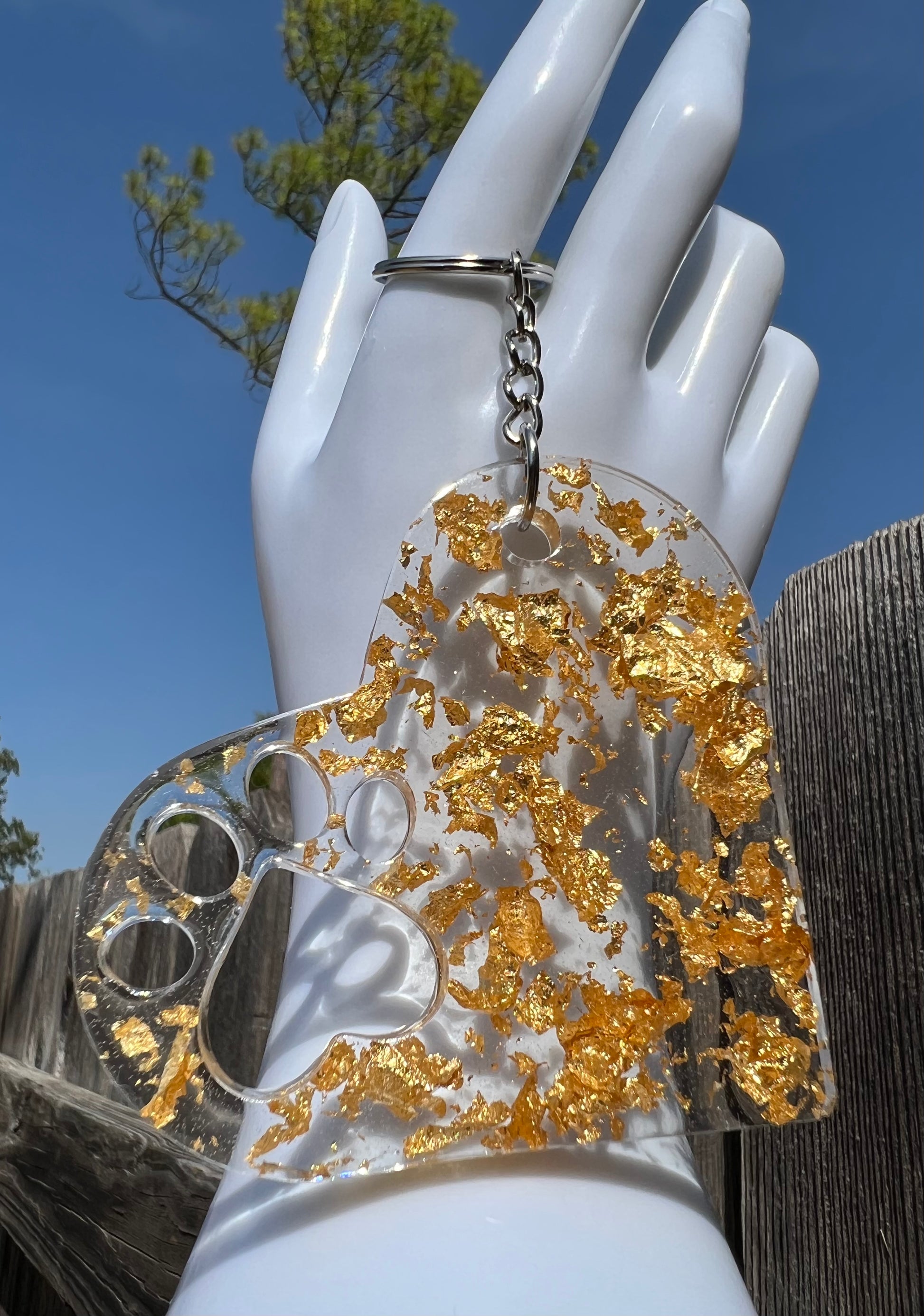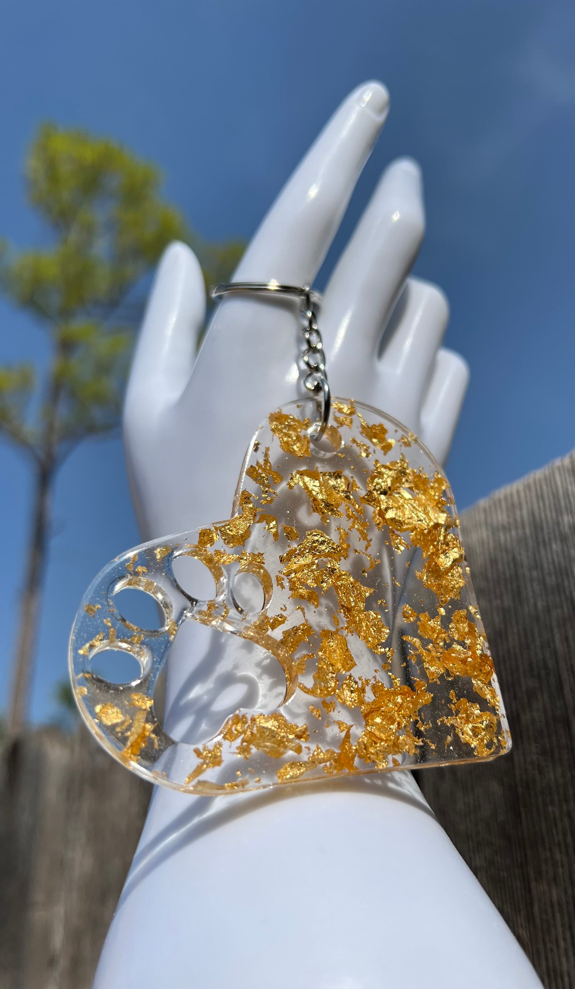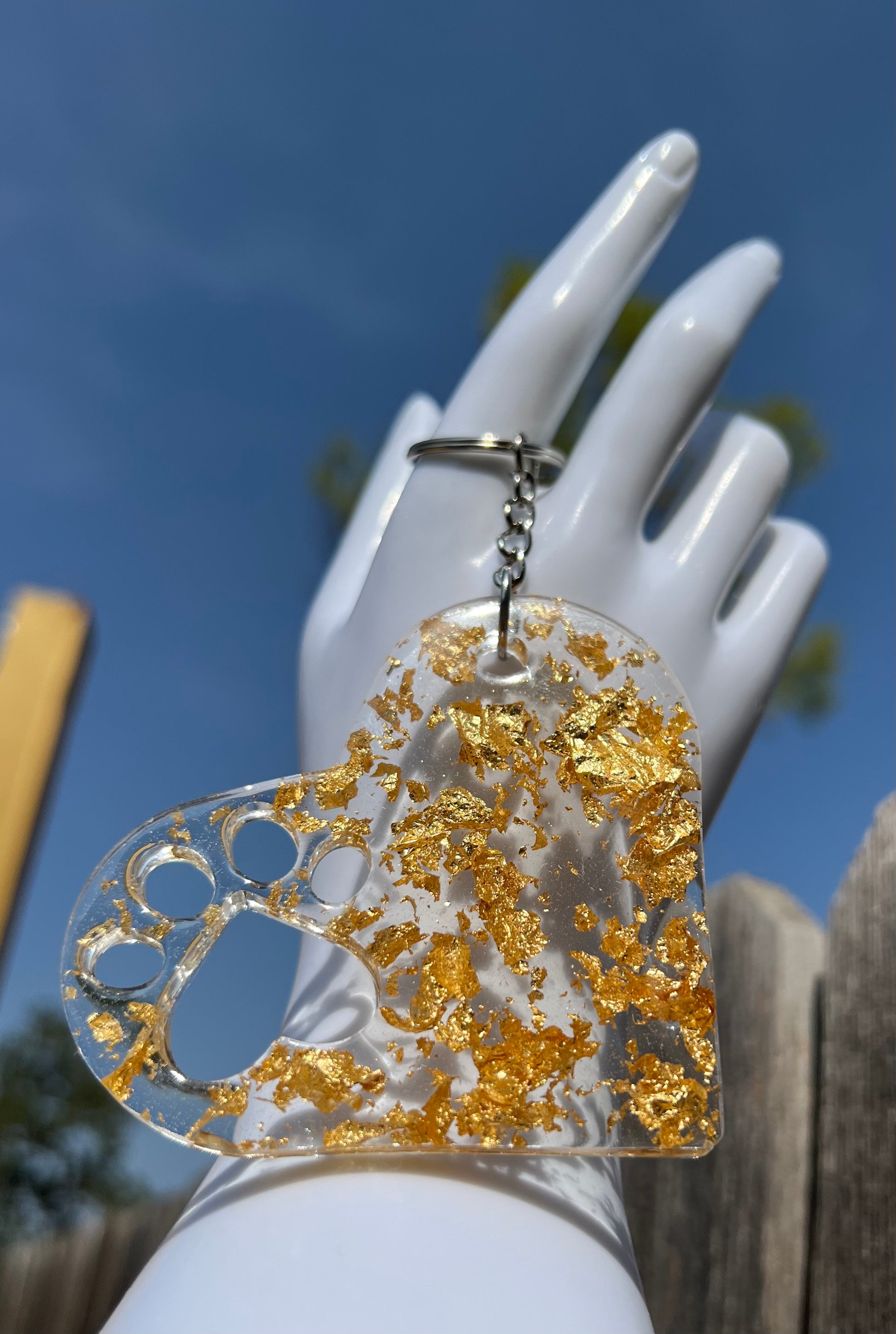 Our handmade epoxy keychain is the perfect accessory to brighten up your keyring. Crafted with care, the keychain features shiny gold flakes for a luxurious touch. Add a bit of sparkle to your everyday with this unique keychain.
