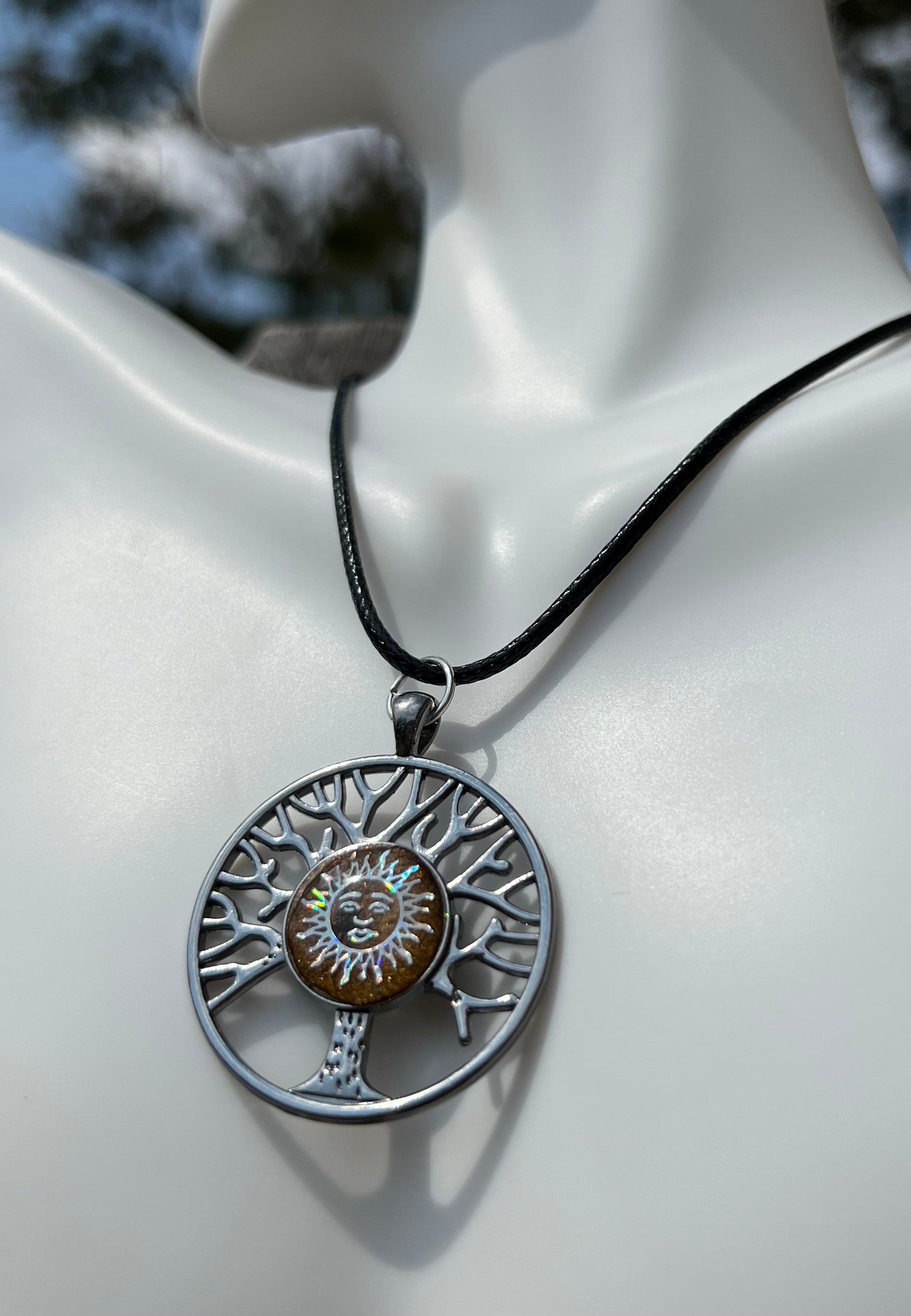 This Holographic Necklace is perfect for adding a touch of sparkle to any outfit. Showcasing a tree of life design, this necklace features a stunning fall-brown background with a sun holographic on top for an eye-catching look. Its lightweight material makes this statement piece comfortable to wear all day long.