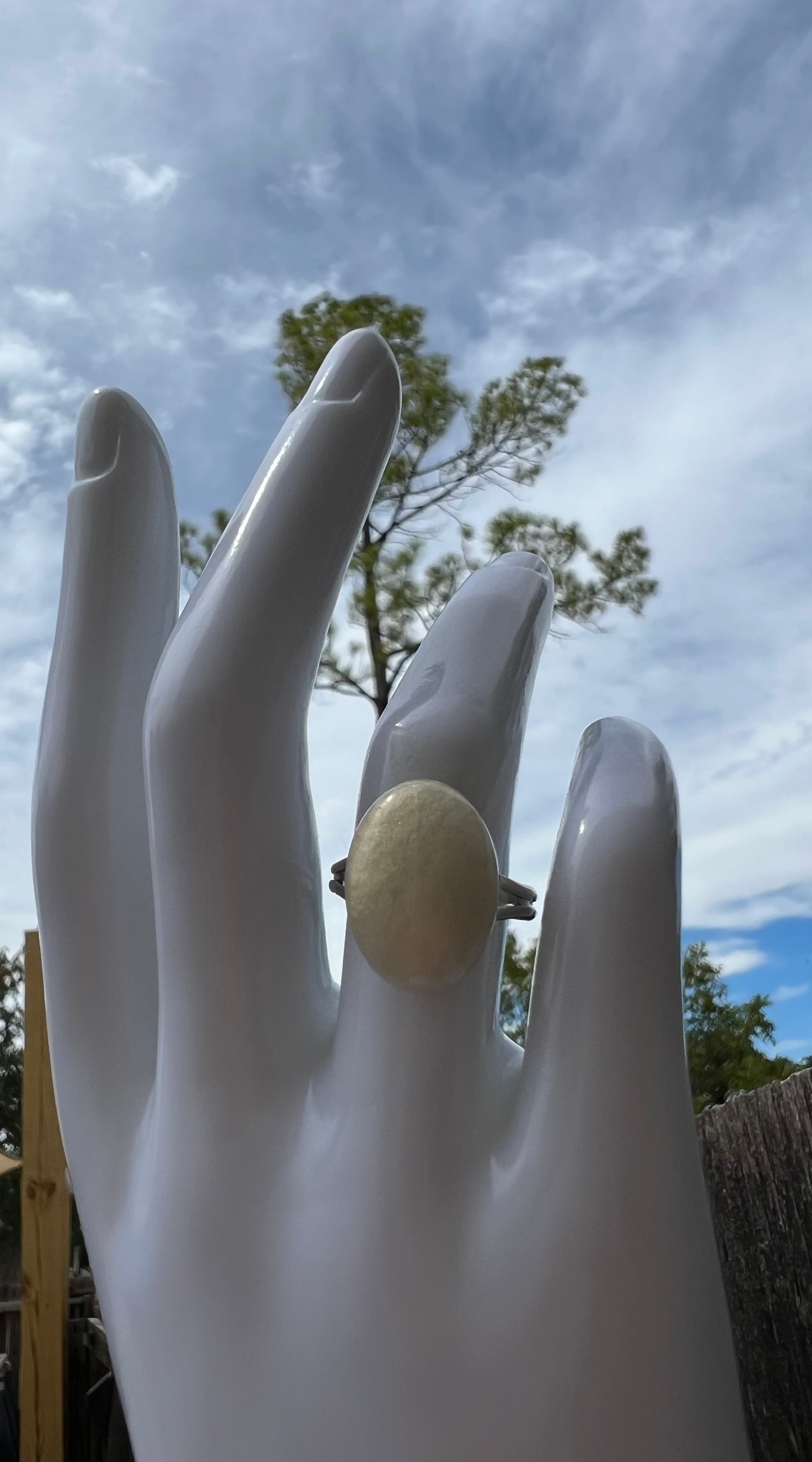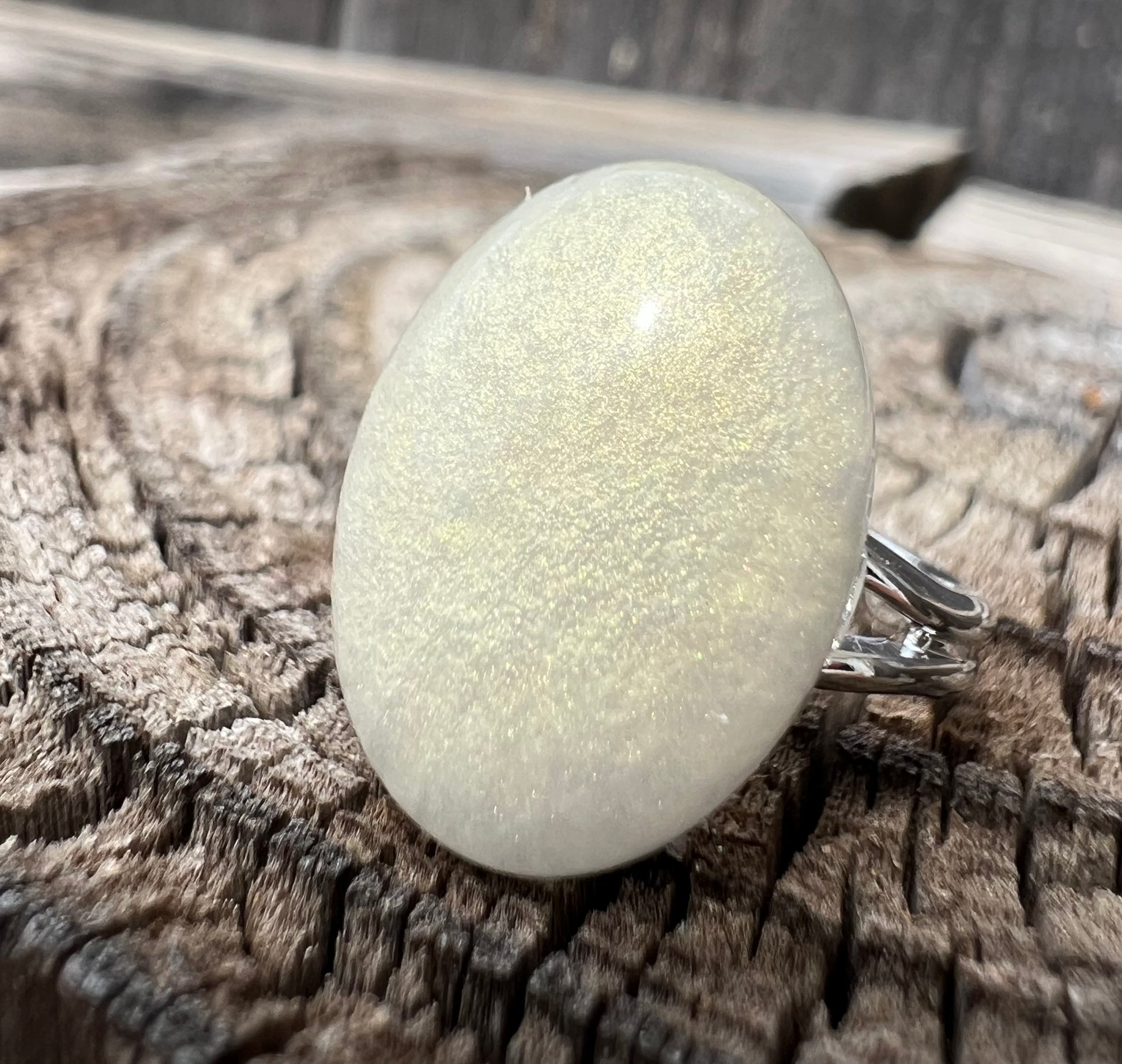 Crafted with an adjustable silver band and a handmade gem, this ring is both stylish and practical. The gem is made using epoxy and a beautiful pearl white colorant, giving it an elegant look. Perfect for any occasion or outfit.